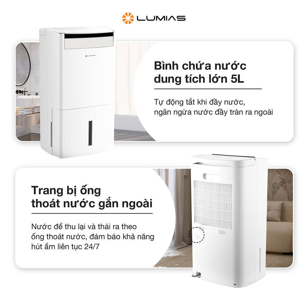 Để tối ưu hóa trải nghiệm sử dụng, máy hút ẩm 26L Lumias D6S-26L thiết kế 2 tùy chọn xử lý nước tiện dụng gồm: