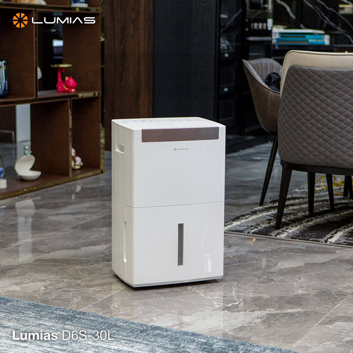 Máy hút ẩm kiêm lọc không khí Lumias D6S-30L có công suất hút ẩm mạnh mẽ lên đến 30L mỗi ngày, phù hợp cho diện tích rộng tới 125m². Máy được trang bị bảng điều khiển cảm ứng, cùng khả năng điều khiển thông minh qua ứng dụng MiHome. Lumias D6S-30L tích hợp bộ lọc ion bạc giúp làm sạch không khí, hoạt động êm ái và có bình chứa nước dung tích lớn 7.9L. Các tính năng an toàn gồm tự động dừng khi bình đầy và tự động dừng khi máy bị nghiêng.