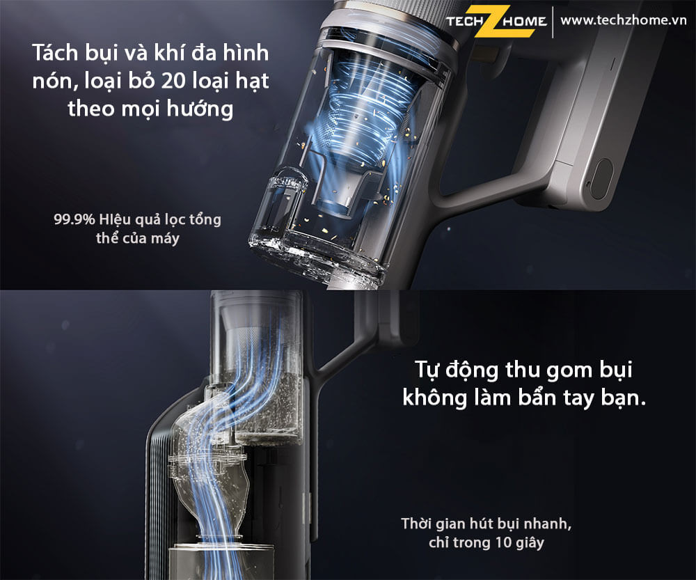 - Tự động chuyển bụi vào ngăn chứa: Trạm sạc Z10S sẽ tự động thu gom bụi bẩn từ máy hút bụi và chuyển vào túi bụi kín, ngăn bụi tái phát tán trở lại không khí. Chỉ một lần nhấn để xả bụi rảnh tay trong 10 giây*, giúp việc dọn dẹp sau đó đơn giản hơn.
