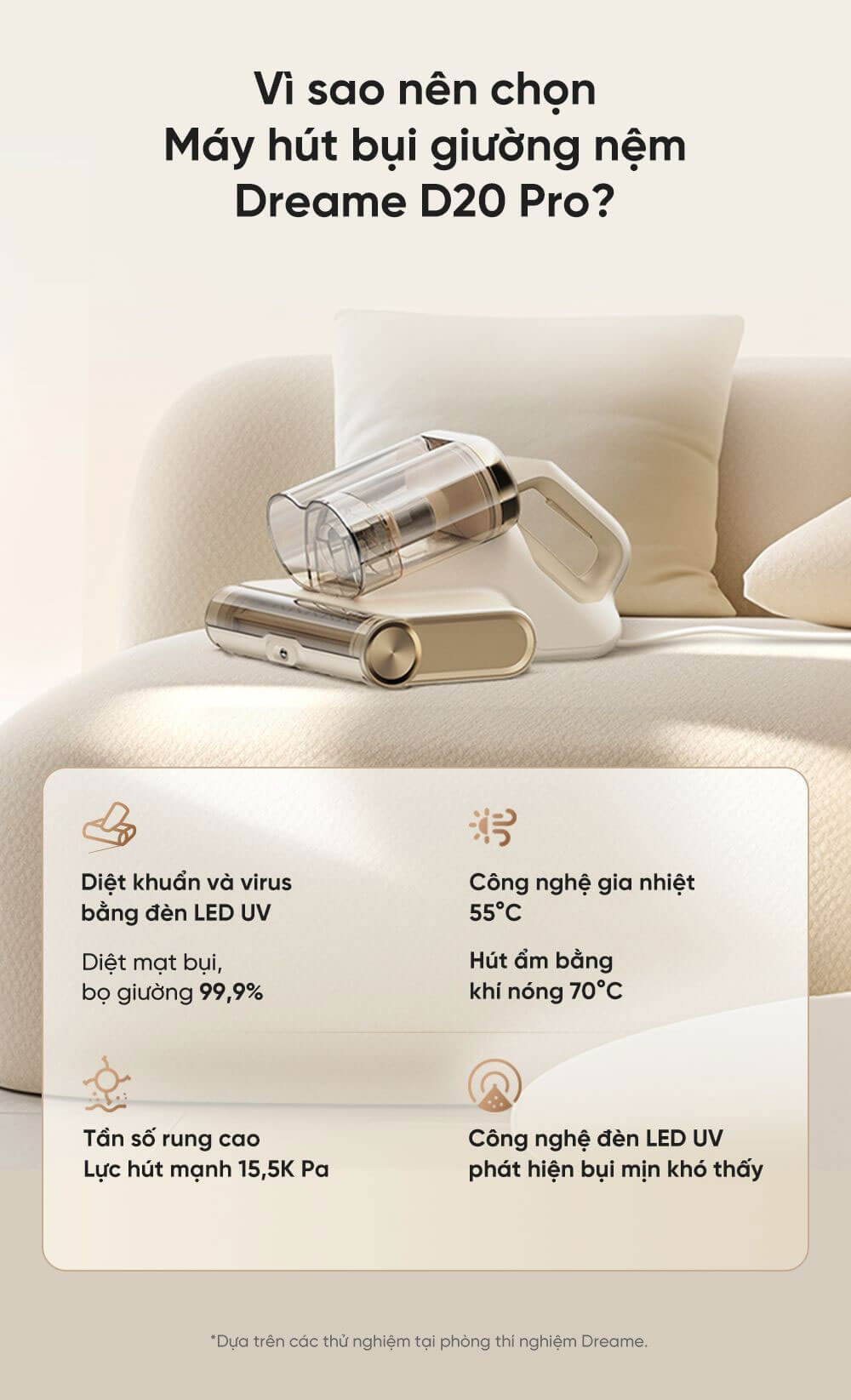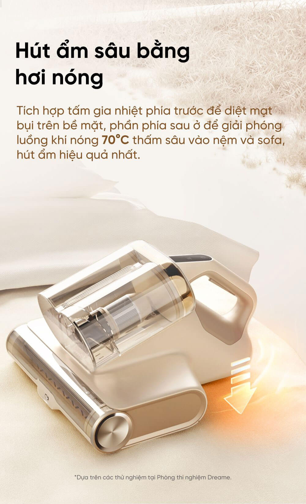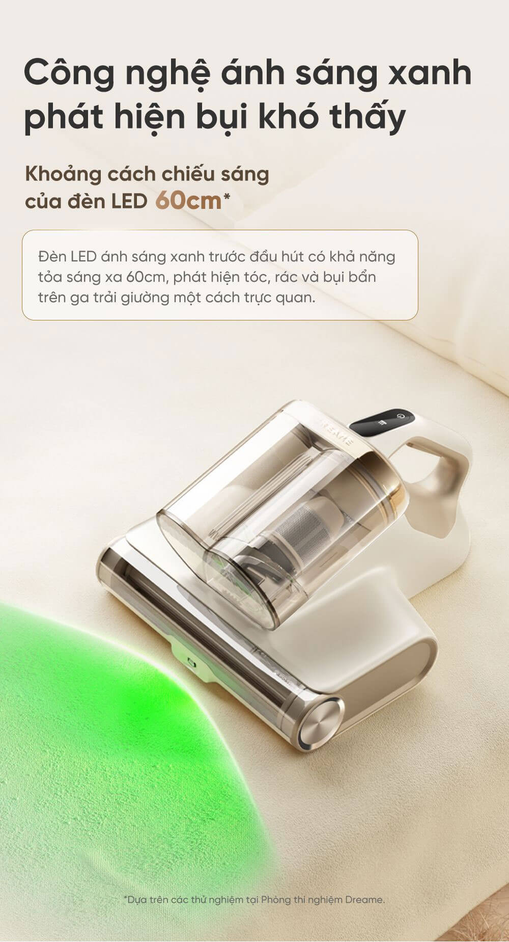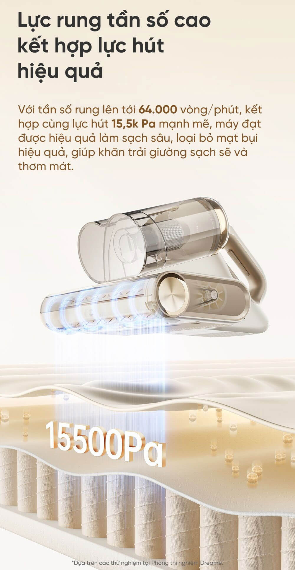 - Lực hút mạnh 15,5k Pa, lực rung tần số cao 64.000 BPM: hút sạch rác, bụi mịn khó thấy từ sâu bên dưới nệm