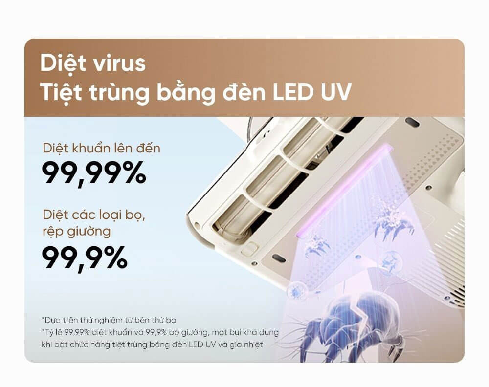 - Tích hợp đèn LED UV: diệt virus, diệt trùng lên đến 99,99%