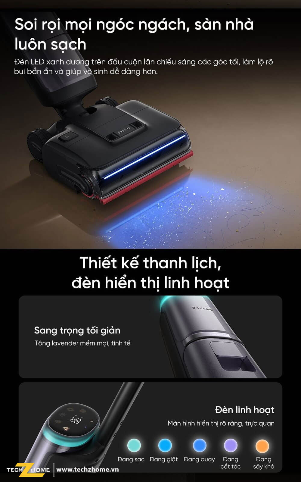 - Đầu cuộn lăn thiết kế tinh gọn tích hợp với đèn LED xanh giúp chiếu sáng những góc tối và dễ dàng phát hiện bụi bẩn, tóc rụng hay các mảng bám khi dọn dẹp vào ban đêm. Ngay cả dưới ánh sáng ban ngày, hệ thống LED xanh trên H16 Pro Steam giúp phát hiện lông thú cưng và các mảnh vụn li ti hiệu quả hơn hẳn so với đèn LED trắng trên các dòng máy cũ. Công nghệ này không chỉ đảm bảo sàn nhà sạch sâu mọi lúc mà còn giúp luồng hơi nước trở nên rõ nét hơn.