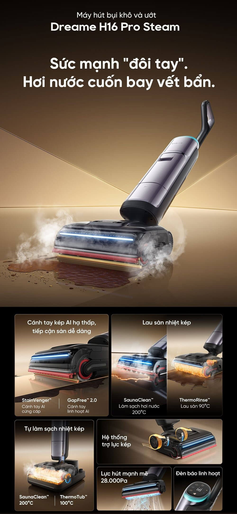 Máy lau nhà cầm tay Dreame H16 Pro Steam - Công nghệ làm sạch nhiệt kép kết hợp cánh tay kép đầu tiên trên thế giới. Công nghệ lau nhà bằng hơi nước nóng 200°C và nước nóng 90°C cùng với lực hút siêu lớn 28.000Pa, kết hợp với giặt con lăn bằng nước nóng 100°C, sấy khô con lăn bằng khí nóng 90°C, giúp chinh phục mọi vết bẩn dễ dàng, đồng thời giữ cho ngôi nhà luôn được sạch sẽ với khả năng khử khuẩn sâu.