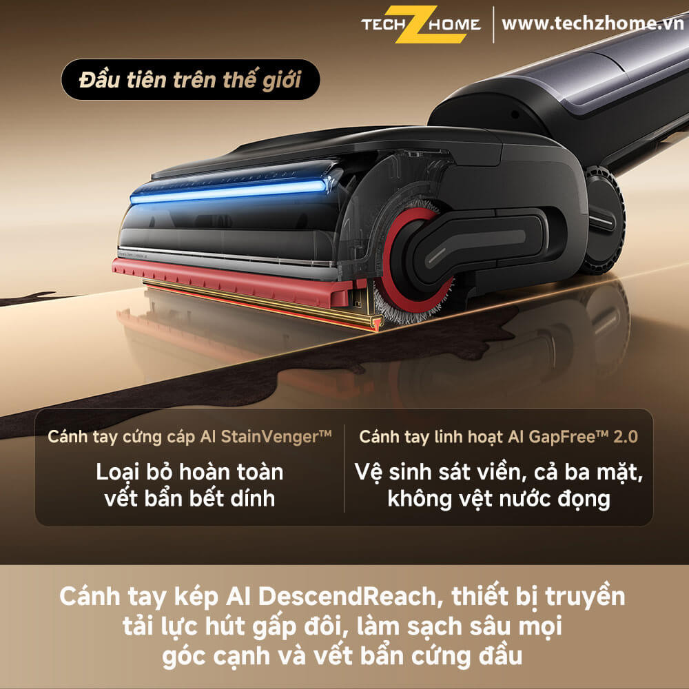 - Cánh tay linh hoạt AI GapFree™ 2.0: Làm sạch sát ba cạnh, 0 kẽ hở, 0 nước đọng