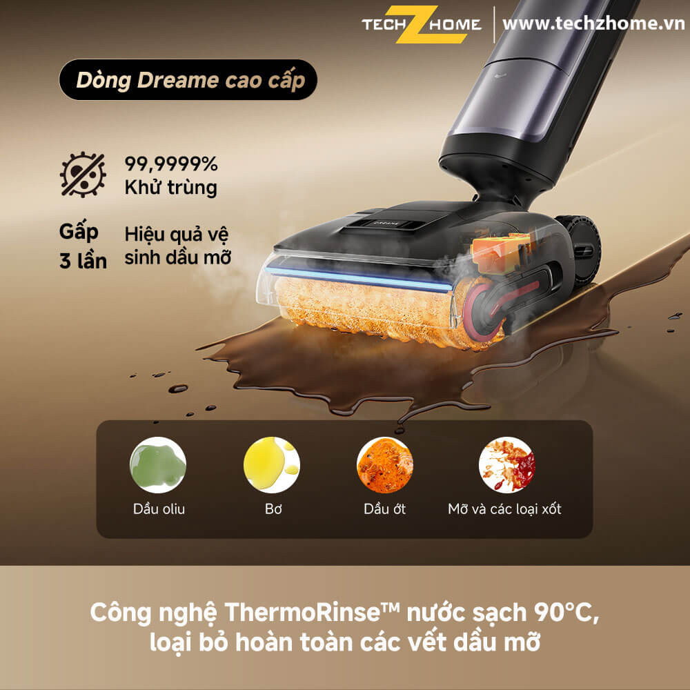 - Hệ thống nước sạch 90°C* mang lại hiệu quả làm sạch gấp 3 lần và đạt khử khuẩn 99,9999% mà không làm hư hại sàn gỗ, tạm biệt nỗi lo đổ tràn hay các sự cố trong bếp.
