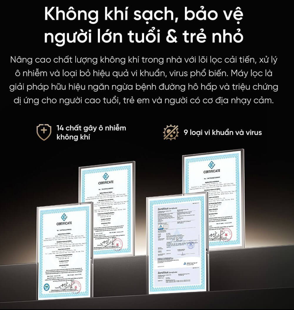 - Nâng cao chất lượng không khí trong nhà với lõi lọc cải tiến, xử lý ô nhiễm và loại bỏ hiệu quả vi khuẩn, virus phổ biến. Máy lọc là giải pháp hữu hiệu ngăn ngừa bệnh đường hô hấp và triệu chứng dị ứng cho người cao tuổi, trẻ em và người có cơ địa nhạy cảm.