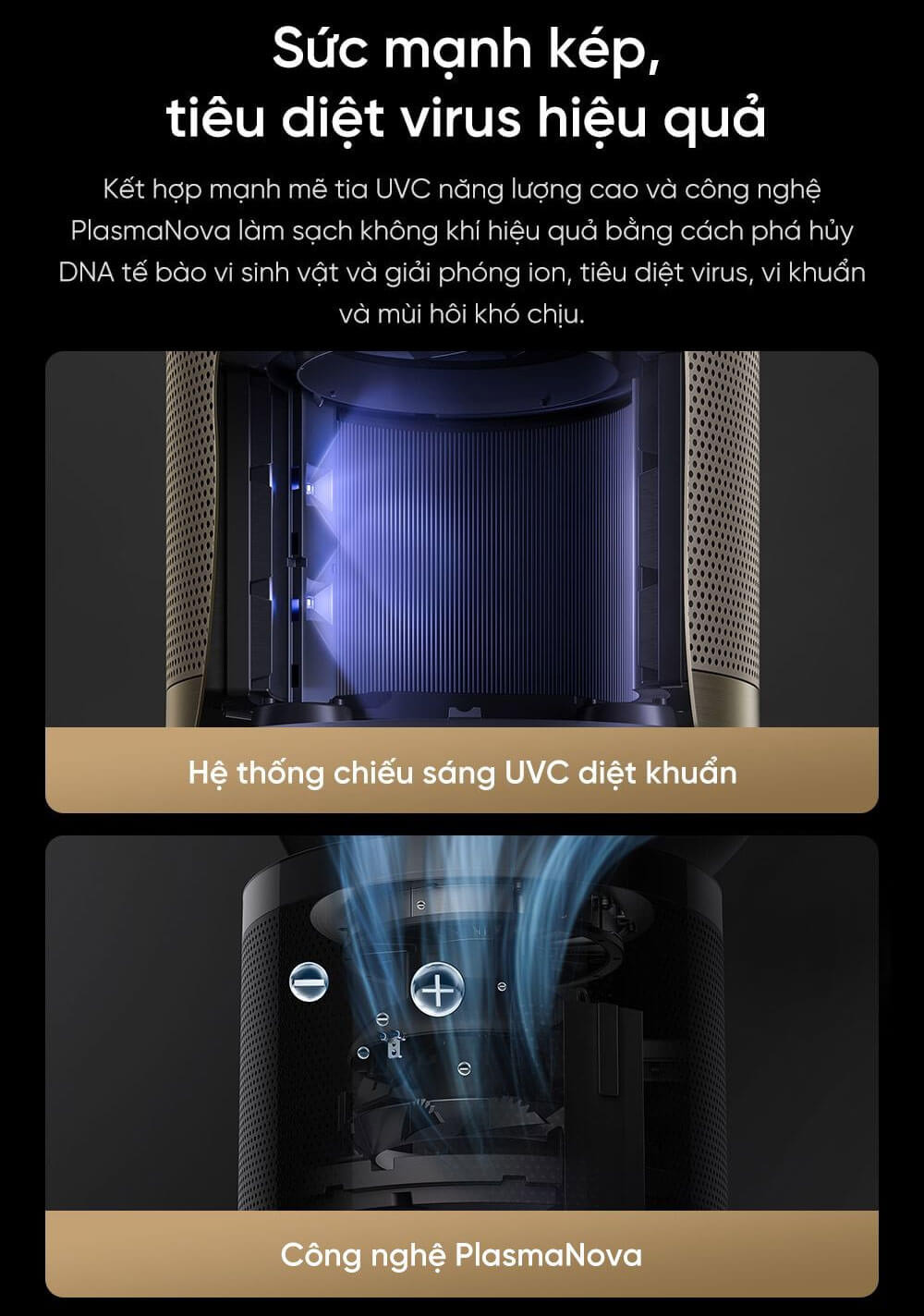 - Kết hợp mạnh mẽ tia UVC năng lượng cao và công nghệ PlasmaNova làm sạch không khí hiệu quả bằng cách phá hủy DNA tế bào vi sinh vật và giải phóng ion, tiêu diệt virus, vi khuẩn và mùi hôi khó chịu.