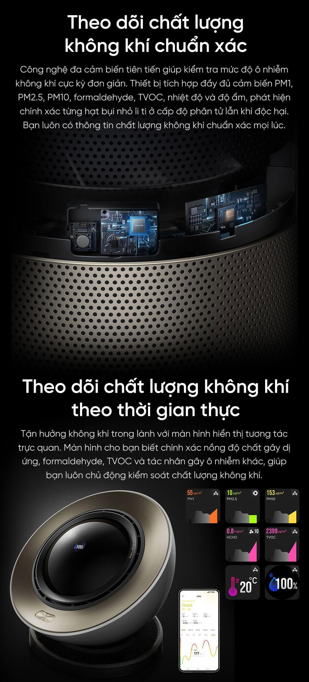 - Công nghệ đa cảm biến tiên tiến giúp kiểm tra mức độ ô nhiễm không khí cực kỳ đơn giản. Thiết bị tích hợp đầy đủ cảm biến PM1, PM2.5, PM10, formaldehyde, TVOC, nhiệt độ và độ ẩm, phát hiện chính xác từng hạt bụi nhỏ li ti ở cấp độ phân tử lẫn khí độc hại.