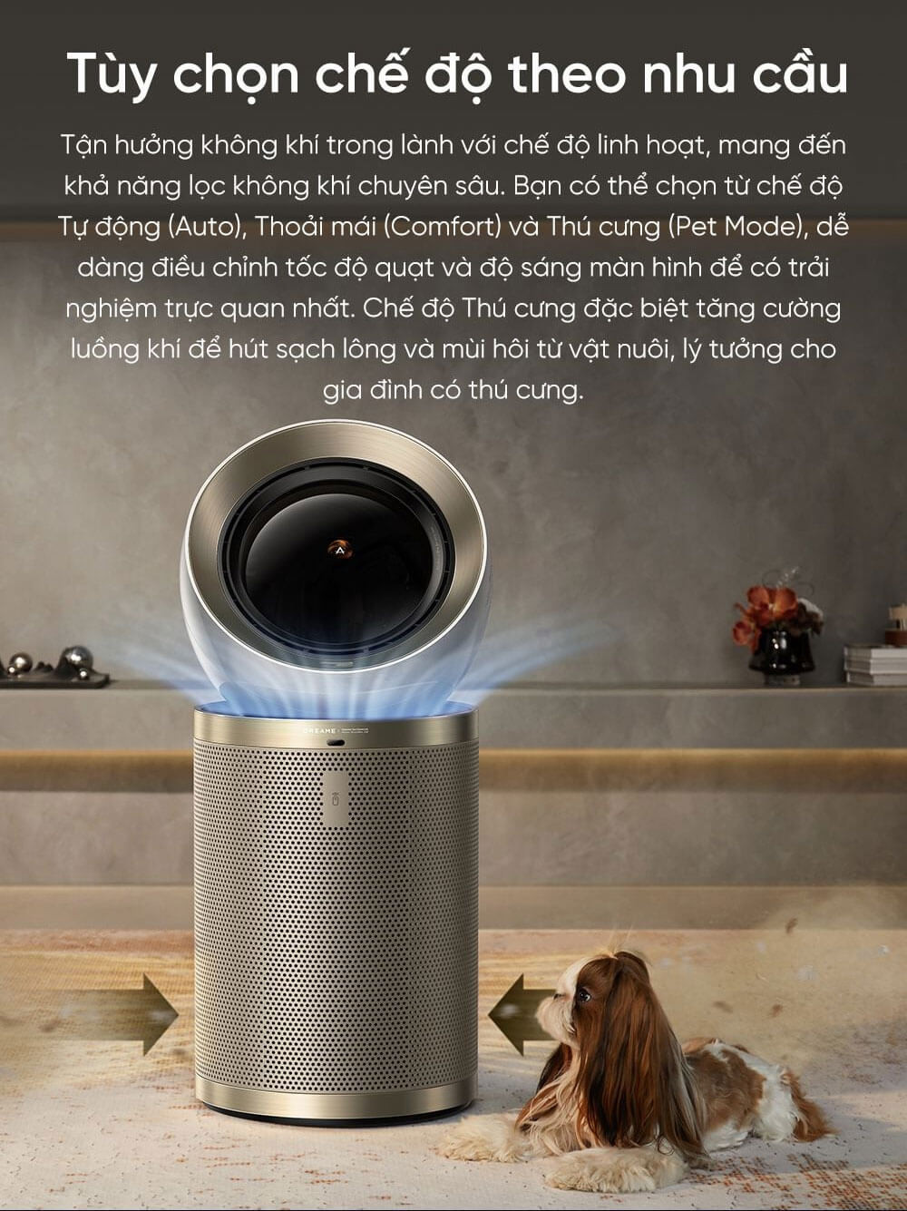 - Tùy chọn chế độ theo nhu cầu: Tận hưởng không khí trong lành với chế độ linh hoạt, mang đến khả năng lọc không khí chuyên sâu. Bạn có thể chọn từ chế độ Tự động (Auto), Thoải mái (Comfort) và Thú cưng (Pet Mode), dễ dàng điều chỉnh tốc độ quạt và độ sáng màn hình để có trải nghiệm trực quan nhất.