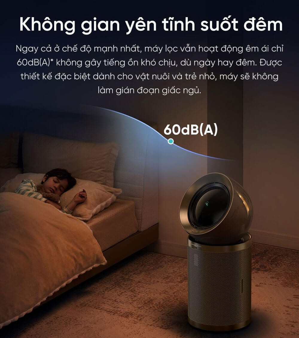 - Hoạt động êm ái, tiếng ồn thấp: Ngay cả ở chế độ mạnh nhất, máy lọc vẫn hoạt động êm ái chỉ 60dB(A) không gây tiếng ồn khó chịu, dù ngày hay đêm.