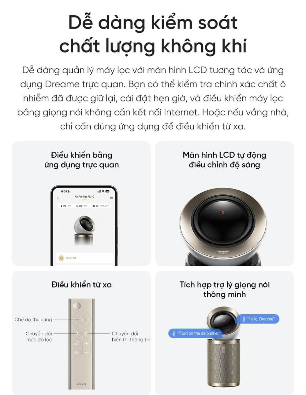 - Dễ dàng quản lý máy lọc với màn hình LCD tương tác và ứng dụng Dreame trực quan. Bạn có thể kiểm tra chính xác chất ô nhiễm đã được giữ lại, cài đặt hẹn giờ, và điều khiển máy lọc bằng giọng nói không cần kết nối Internet. Hoặc nếu vắng nhà, chỉ cần dùng ứng dụng để điều khiển từ xa.