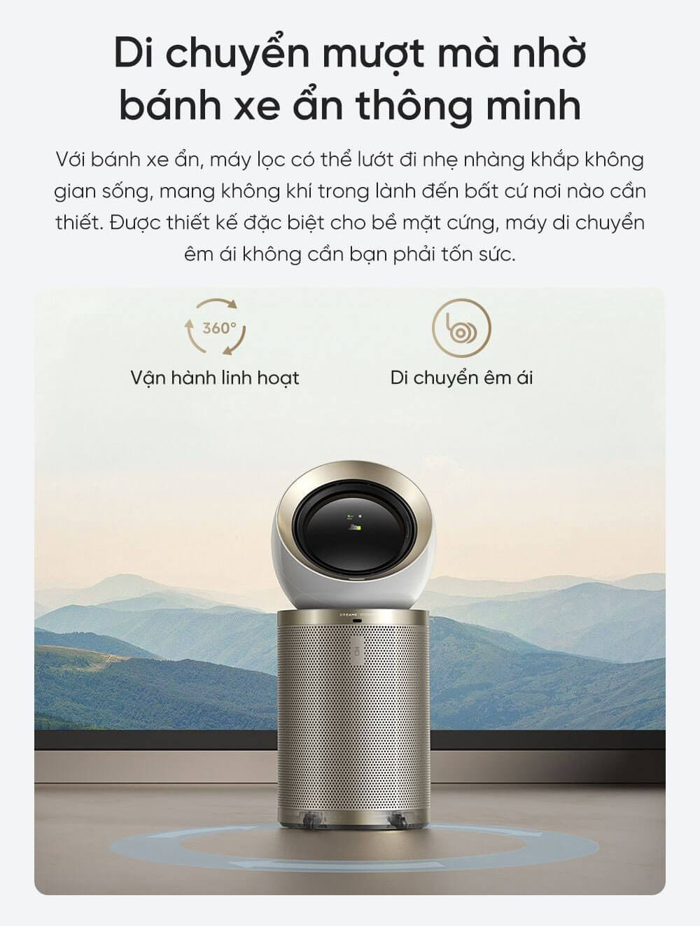 - Di chuyển mượt mà nhờ bánh xe ẩn thông minh: Với bánh xe ẩn, máy lọc có thể lướt đi nhẹ nhàng khắp không gian sống, mang không khí trong lành đến bất cứ nơi nào cần thiết.