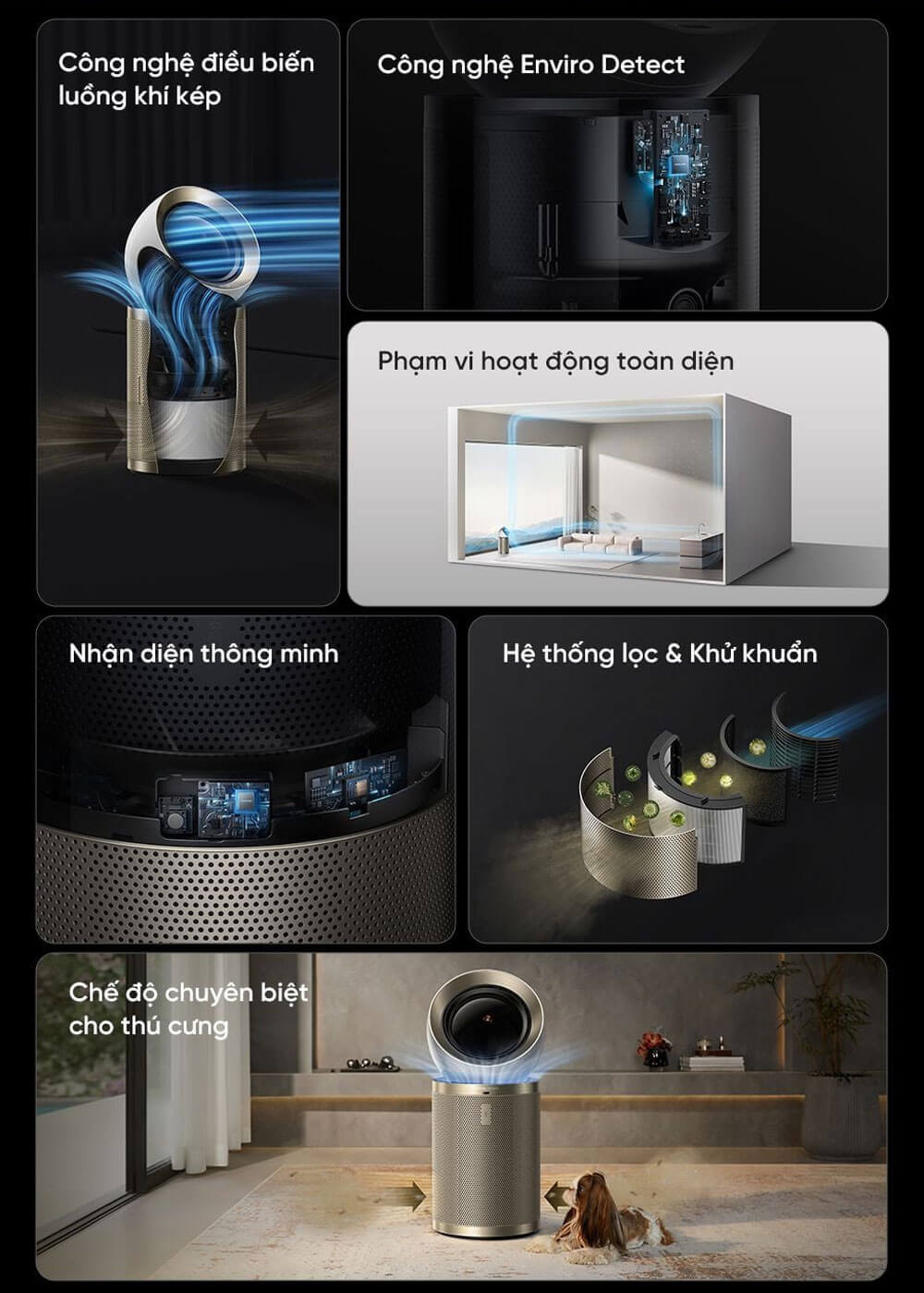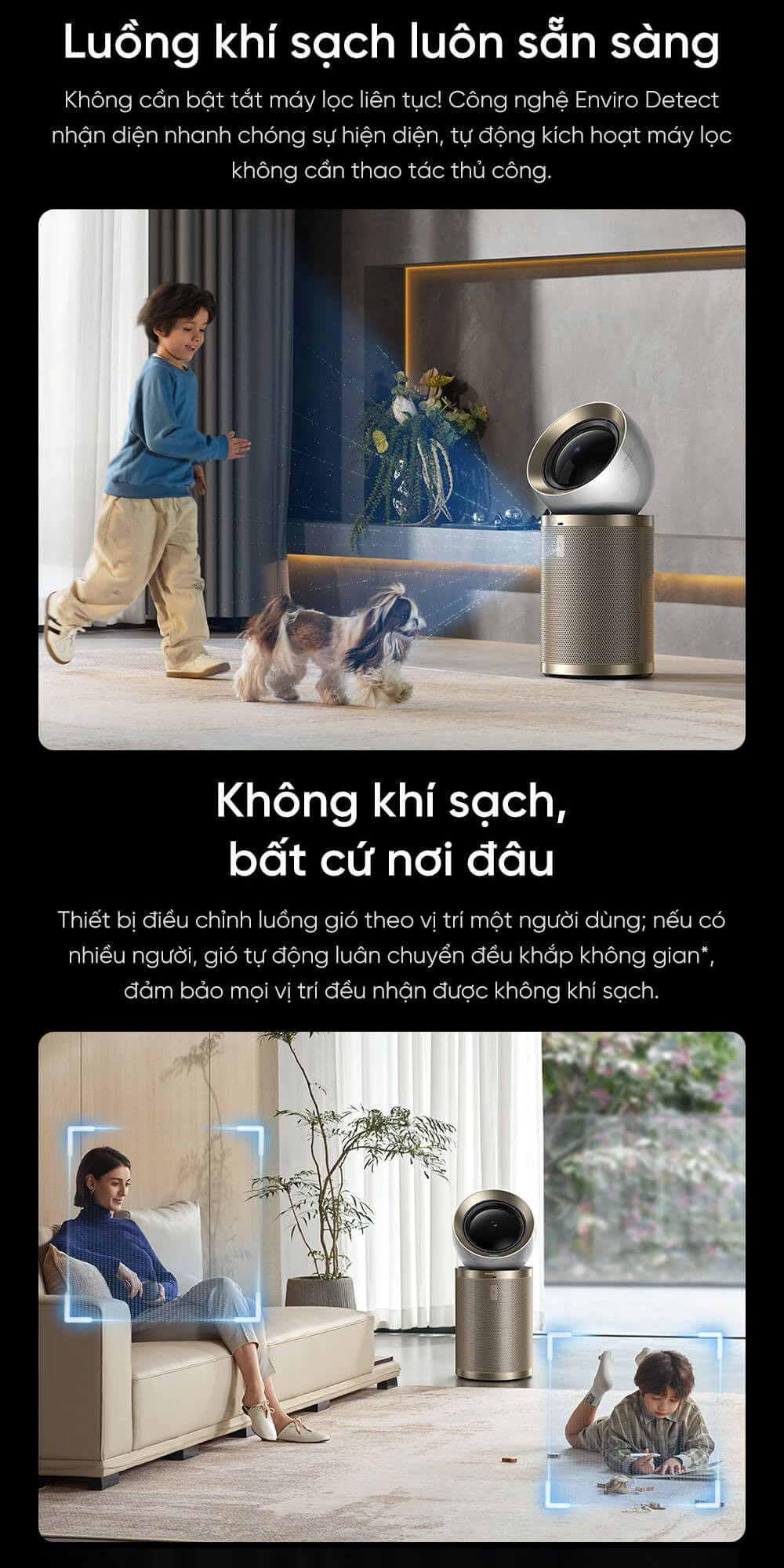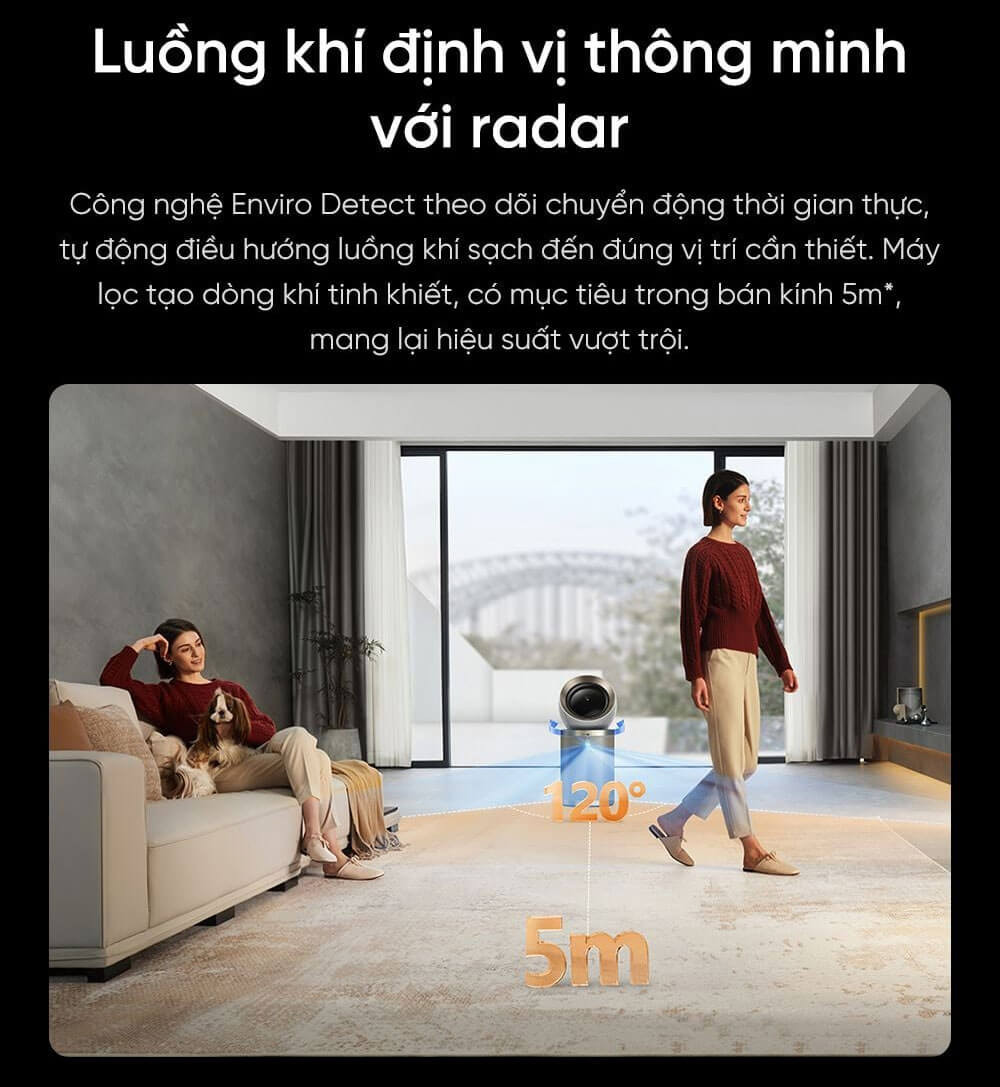 - Luồng khí định vị thông minh với radar: Công nghệ Enviro Detect theo dõi chuyển động thời gian thực, tự động điều hướng luồng khí sạch đến đúng vị trí cần thiết. Máy lọc tạo dòng khí tinh khiết, có mục tiêu trong bán kính 5m, mang lại hiệu suất vượt trội.