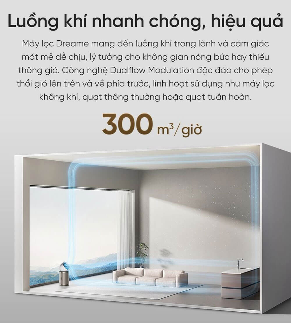 - Cửa thoát khí lớn mang đến 300m³/giờ khí sạch, loại bỏ chất gây ô nhiễm trên toàn bộ không gian sống.