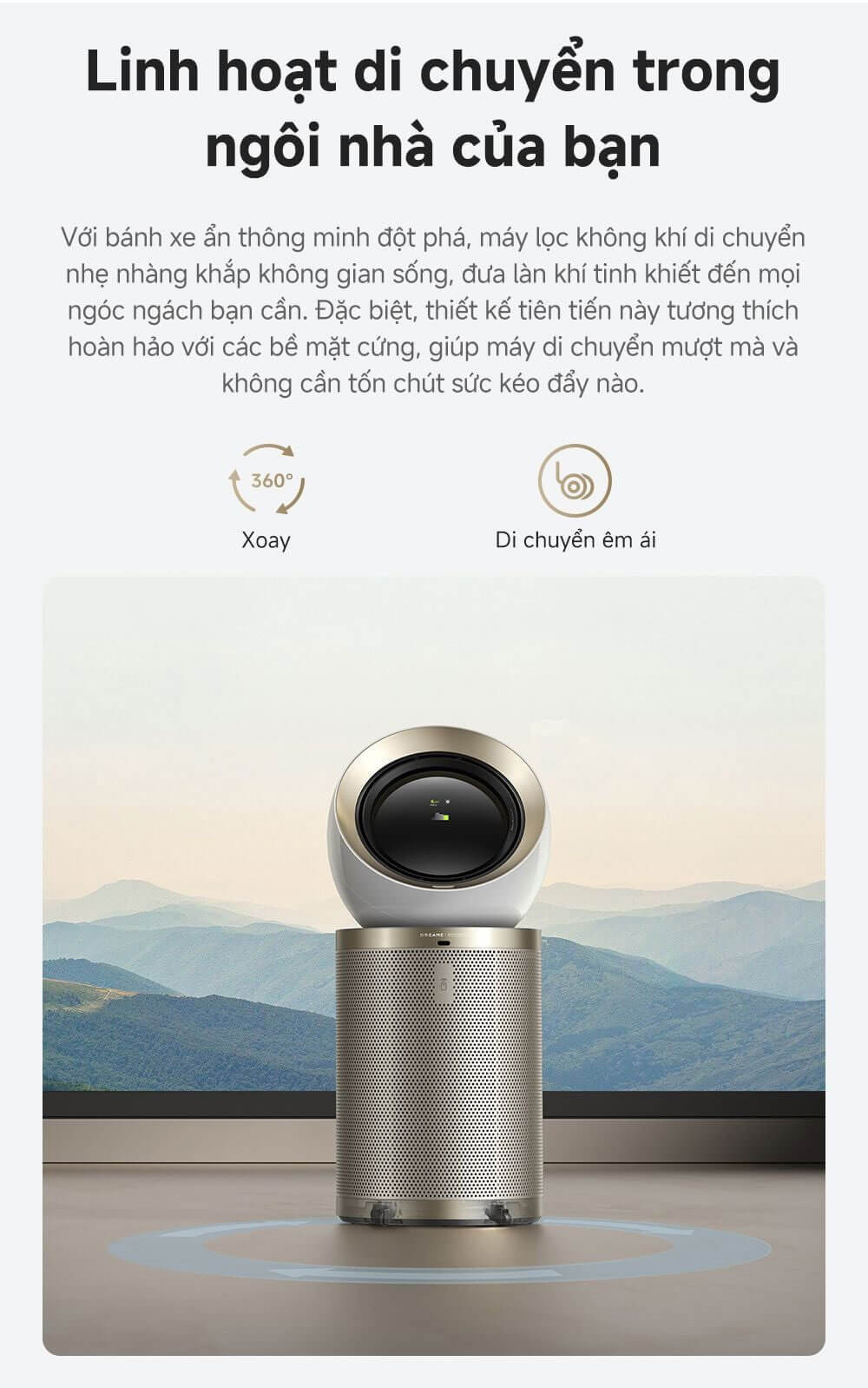 Bánh xe ẩn giúp thiết bị di chuyển mượt mà và dễ dàng trong mọi không gian.