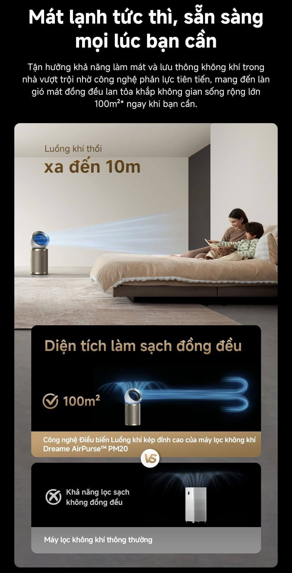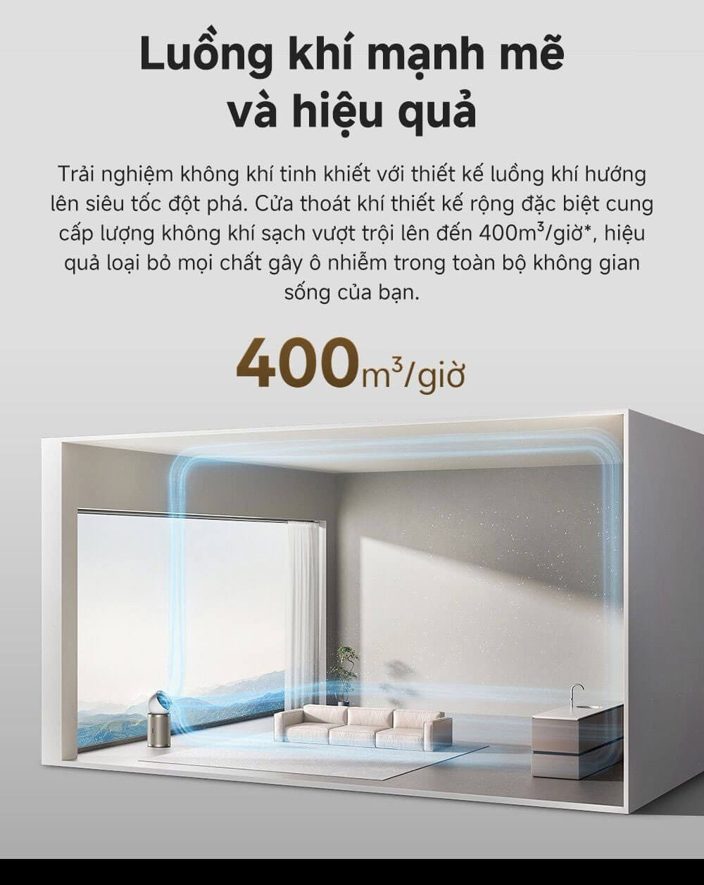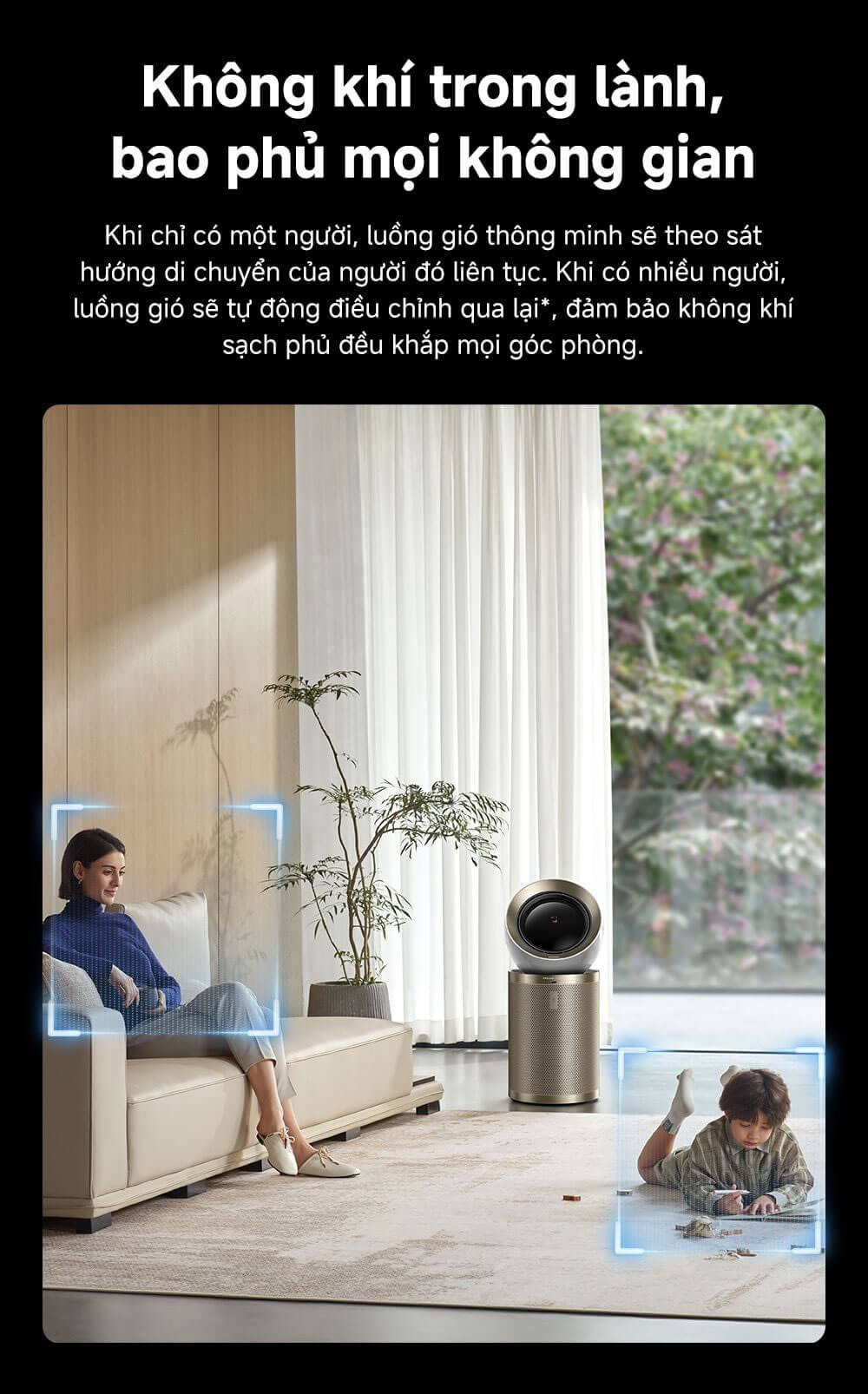 Bao phủ toàn diện mọi không gian: Luồng khí sẽ thổi tập trung theo sự di chuyển khi có một người, luồng khí sẽ tự điều chỉnh qua lại, phân tán đồng đều khi có nhiều người, bao phủ mọi góc phòng bằng luồng khí sạch vượt trội lên đến 400m³/giờ.