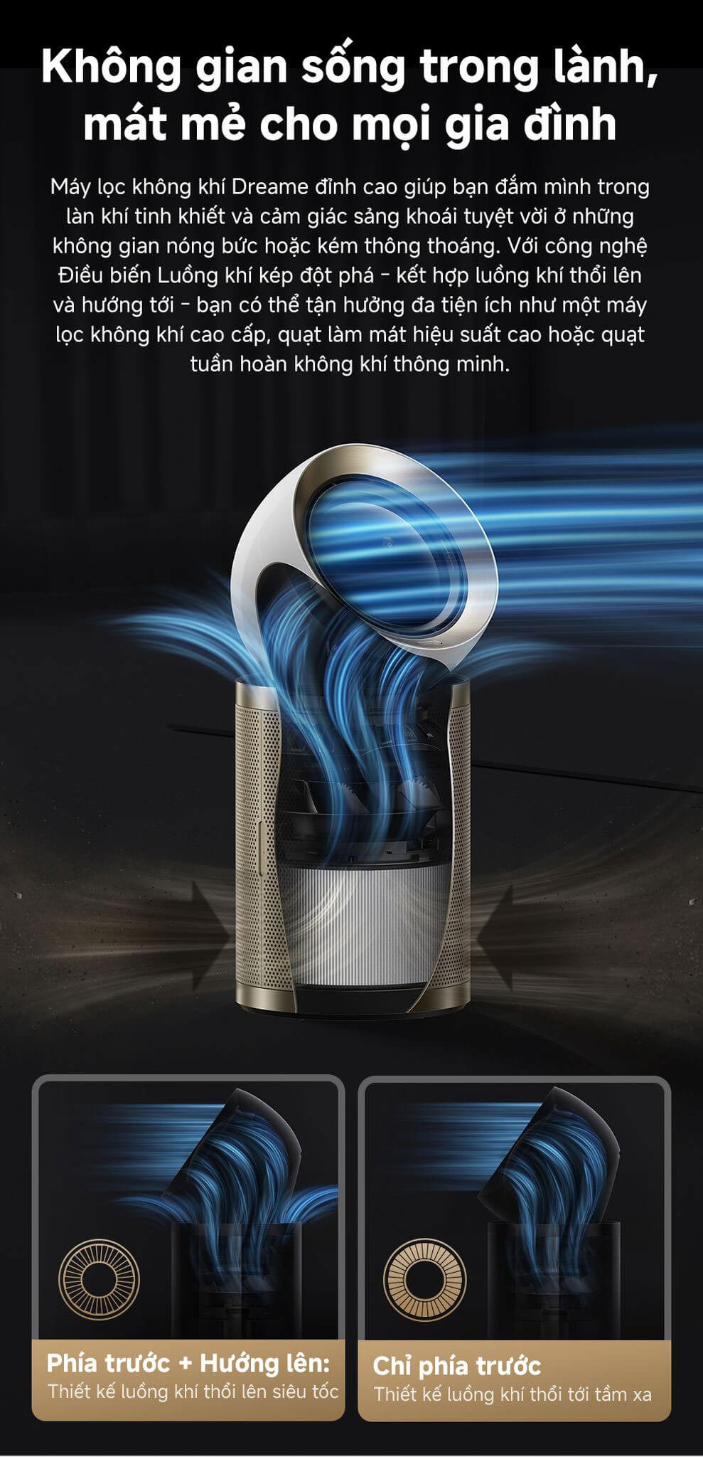Công nghệ Điều biến Luồng khí kép: Luồng khí thổi lên siêu tốc (Thổi về trước và hướng lên) + Luồng khí thổi tới tầm xa (Chỉ thổi về phía trước), làm mát mọi không gian có diện tích lên đến 100m².