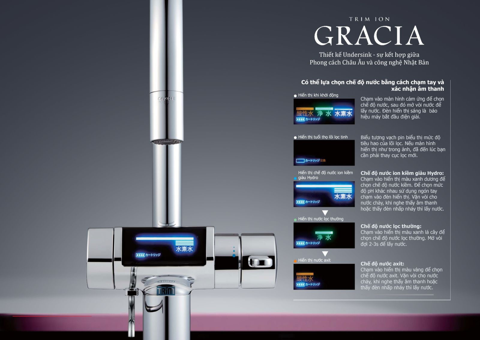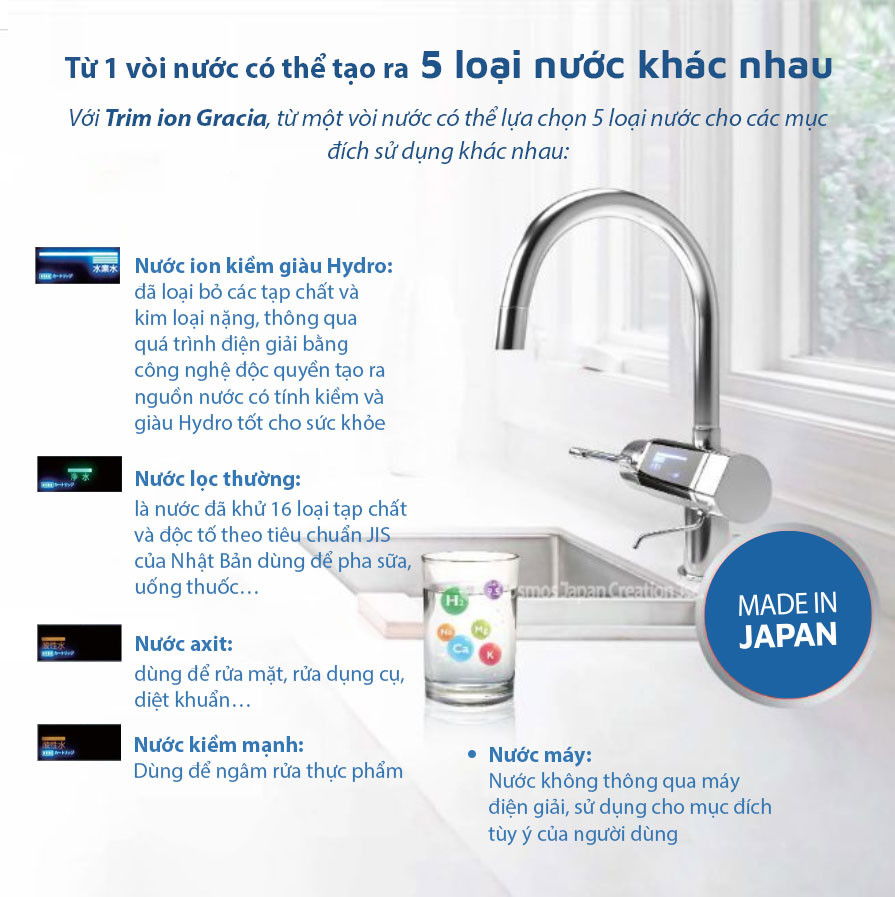 Với Trim ion Gracia, từ một vòi nước có thể lựa chọn 5 loại nước cho các mục đích sử dụng khác nhau: