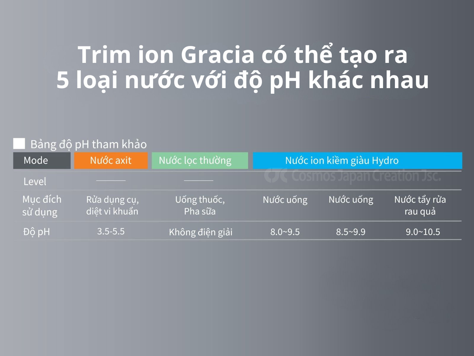 - Tạo ra 5 chế độ nước với độ pH từ 3.5 tới 10.5