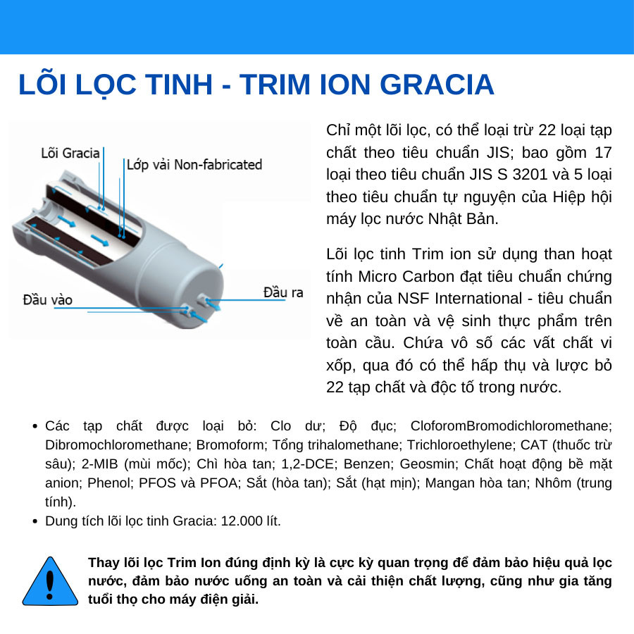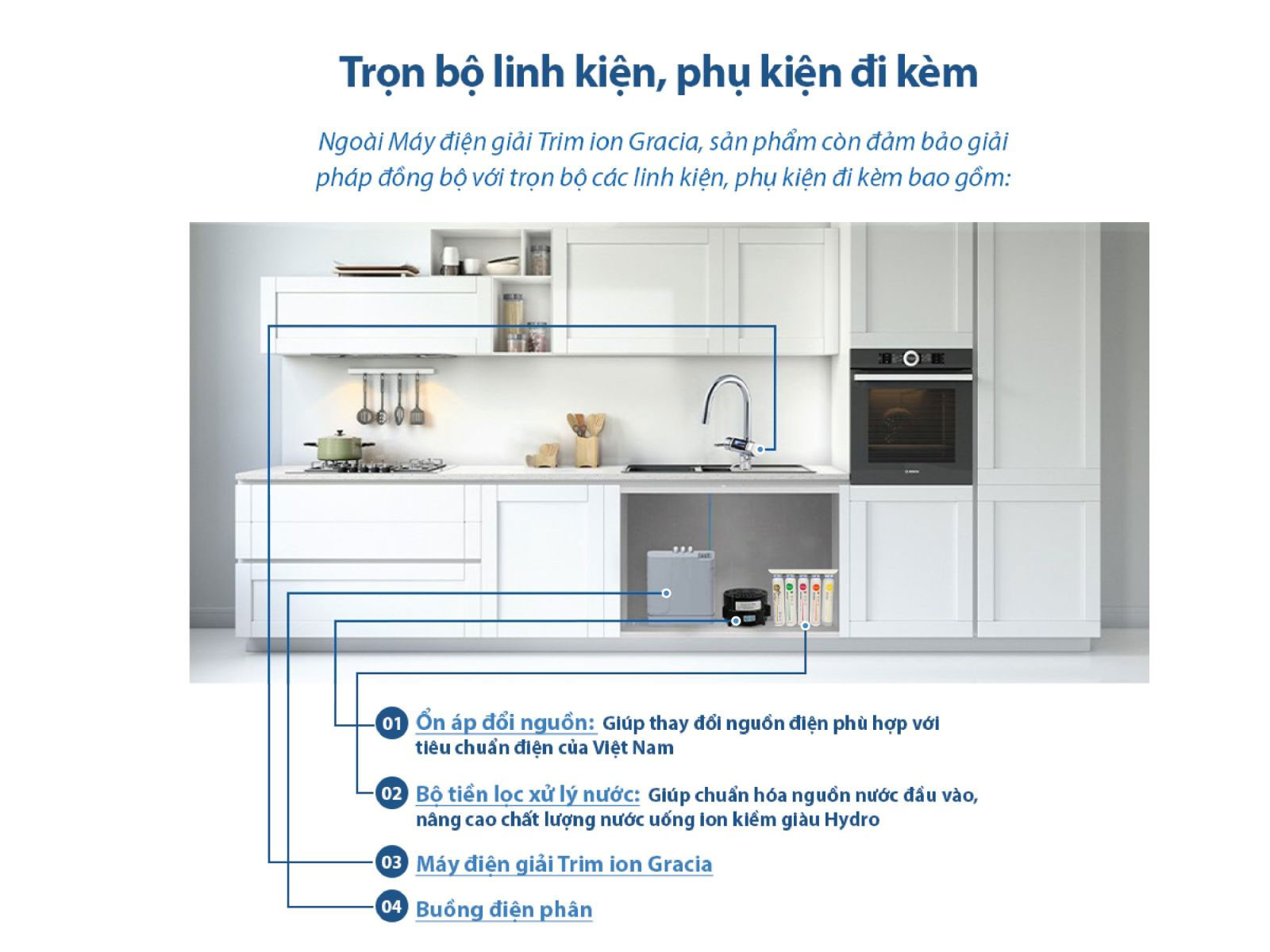 - Trọn bộ phụ kiện đi kèm gồm: Bộ lọc tiền xử lý nước, Máy điện giải Trim ion Gracia & Bộ ổn áp đổi nguồn