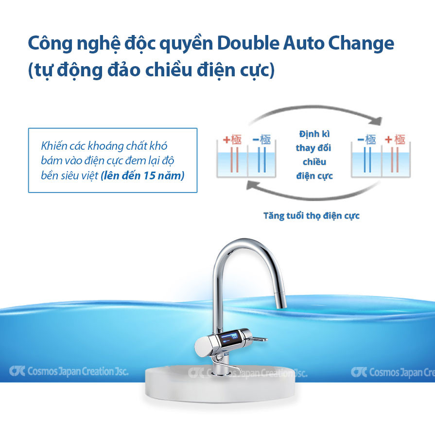 Công nghệ tự động vệ sinh điện cực (công nghệ đổi chiều điện cực và đổi chiều định kì dòng nước, tránh khoáng chất bám vào điện cực, công nghệ độc quyền Double Crossline Auto Change) |