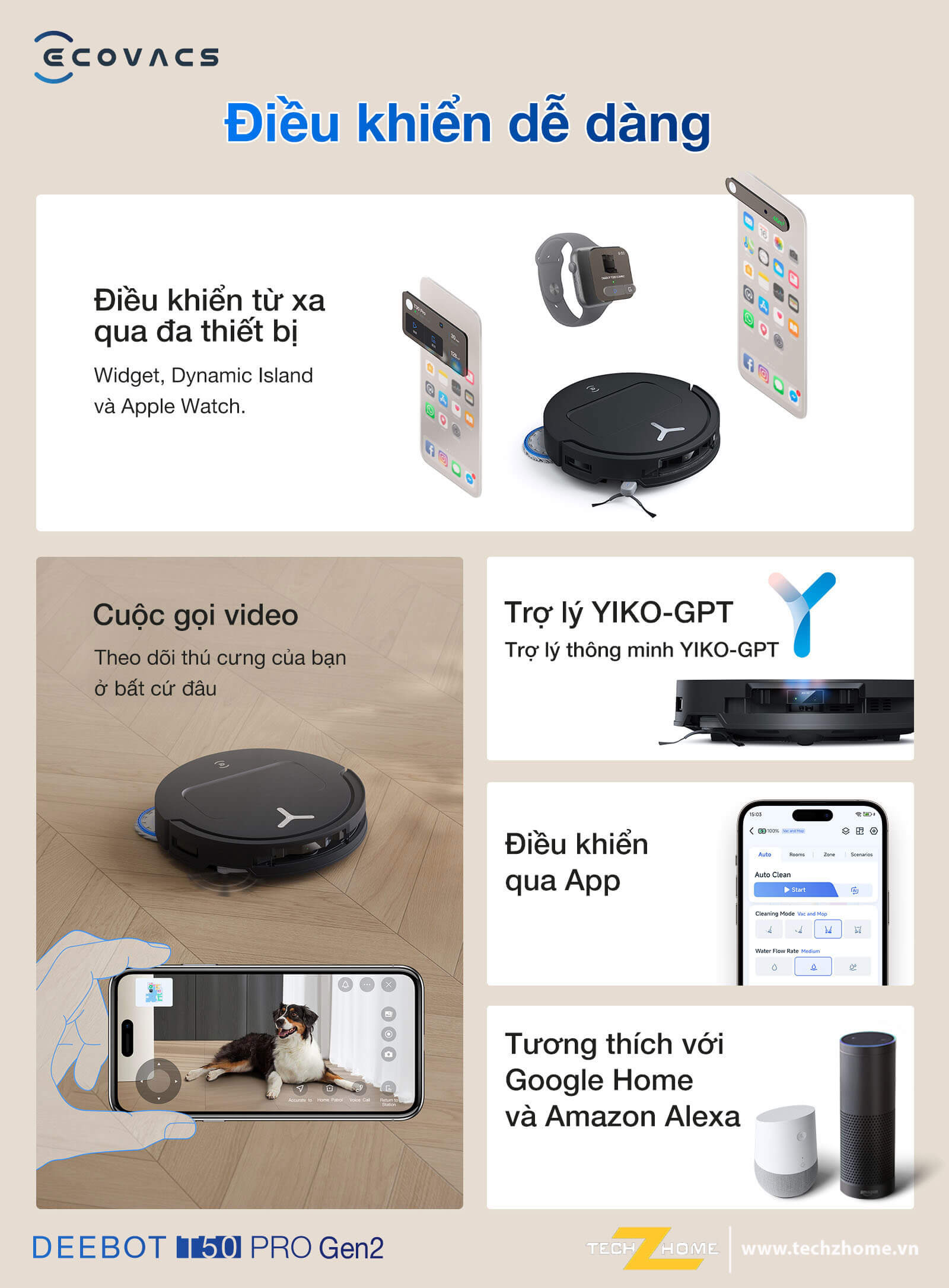 - Dễ dàng điều khiển qua ứng dụng Ecovacs Home và trợ lý giọng nói