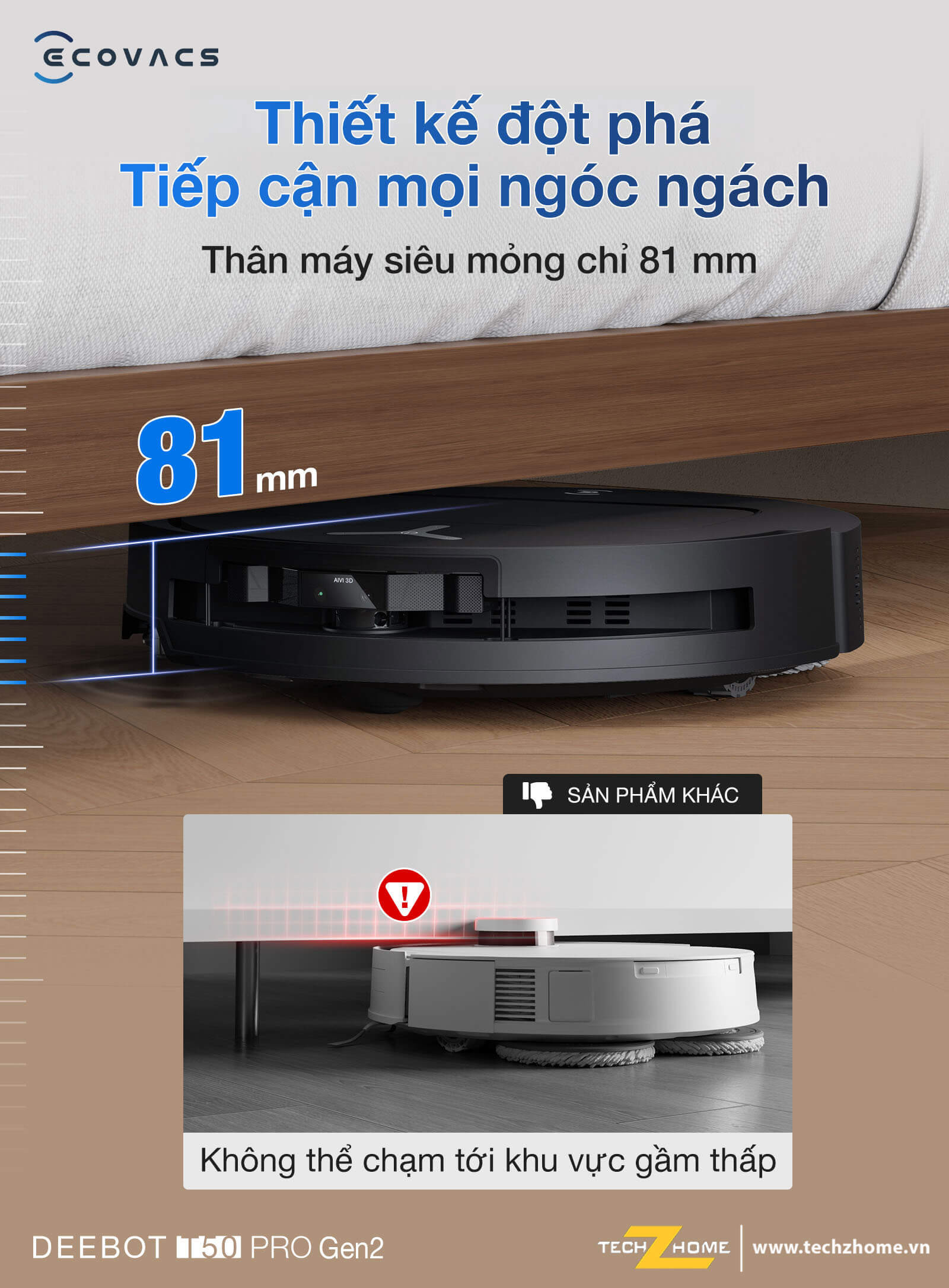 Sở hữu thiết kế mỏng chỉ 81mm, kiểu dáng thấp, robot hút bụi lau nhà T50 PRO Gen2 dễ dàng luồn sâu vào gầm giường, tủ, sofa, xử lý trọn vẹn bụi mịn lẫn rác nhỏ tại những vùng tay khó chạm tới.