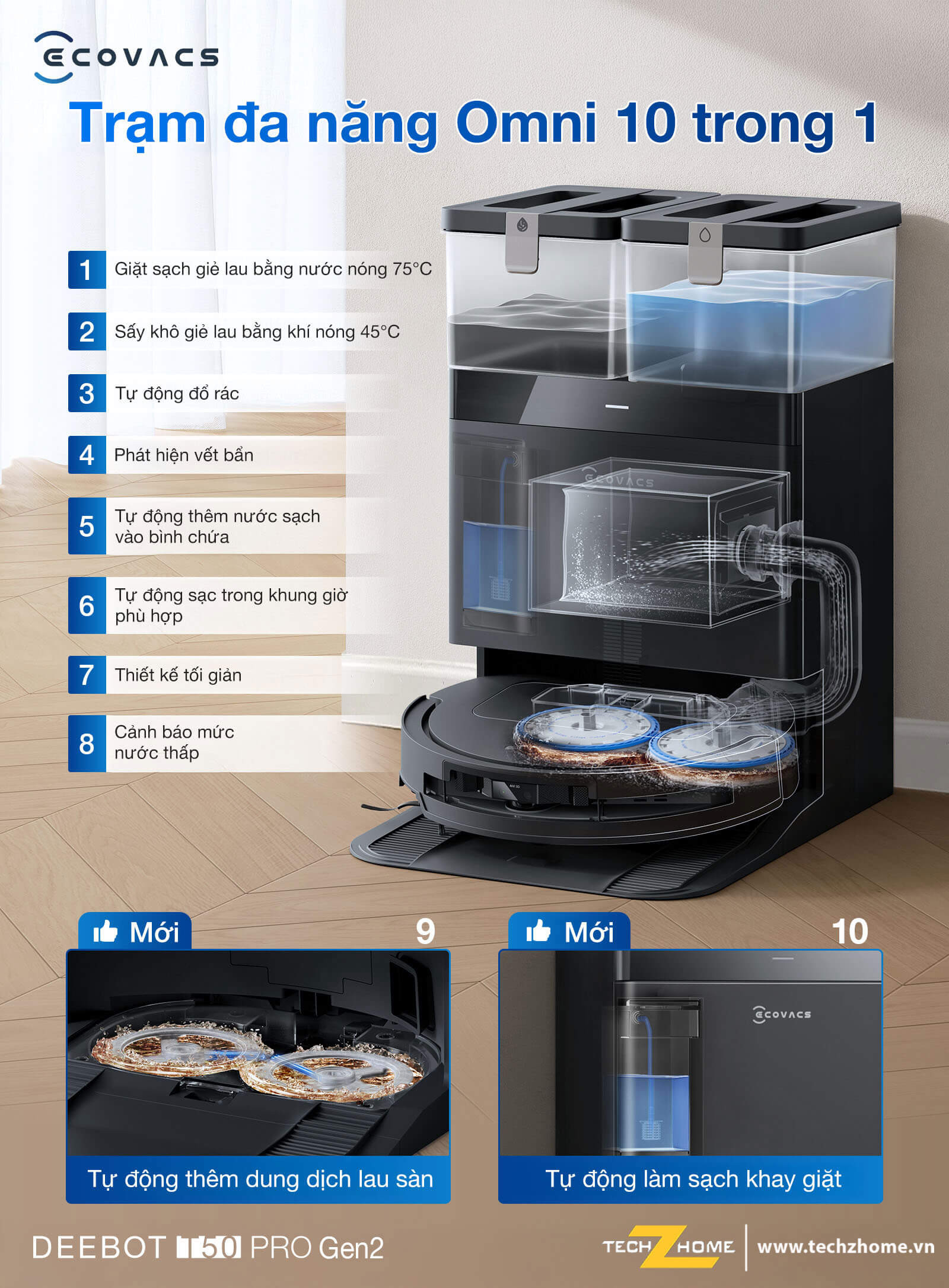 Trạm OMNI đa năng trên DEEBOT T50 PRO Gen2 tạo nên trải nghiệm dọn dẹp gần như rảnh tay.