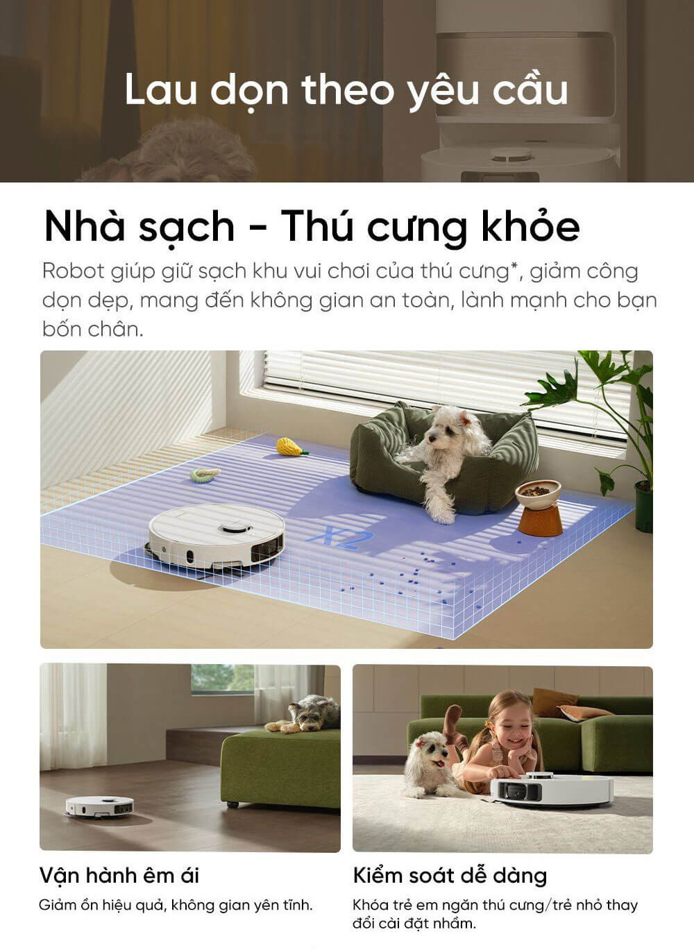 - Robot giúp giữ sạch khu vui chơi của thú cưng, giảm công dọn dẹp, mang đến không gian an toàn, lành mạnh cho bạn bốn chân.