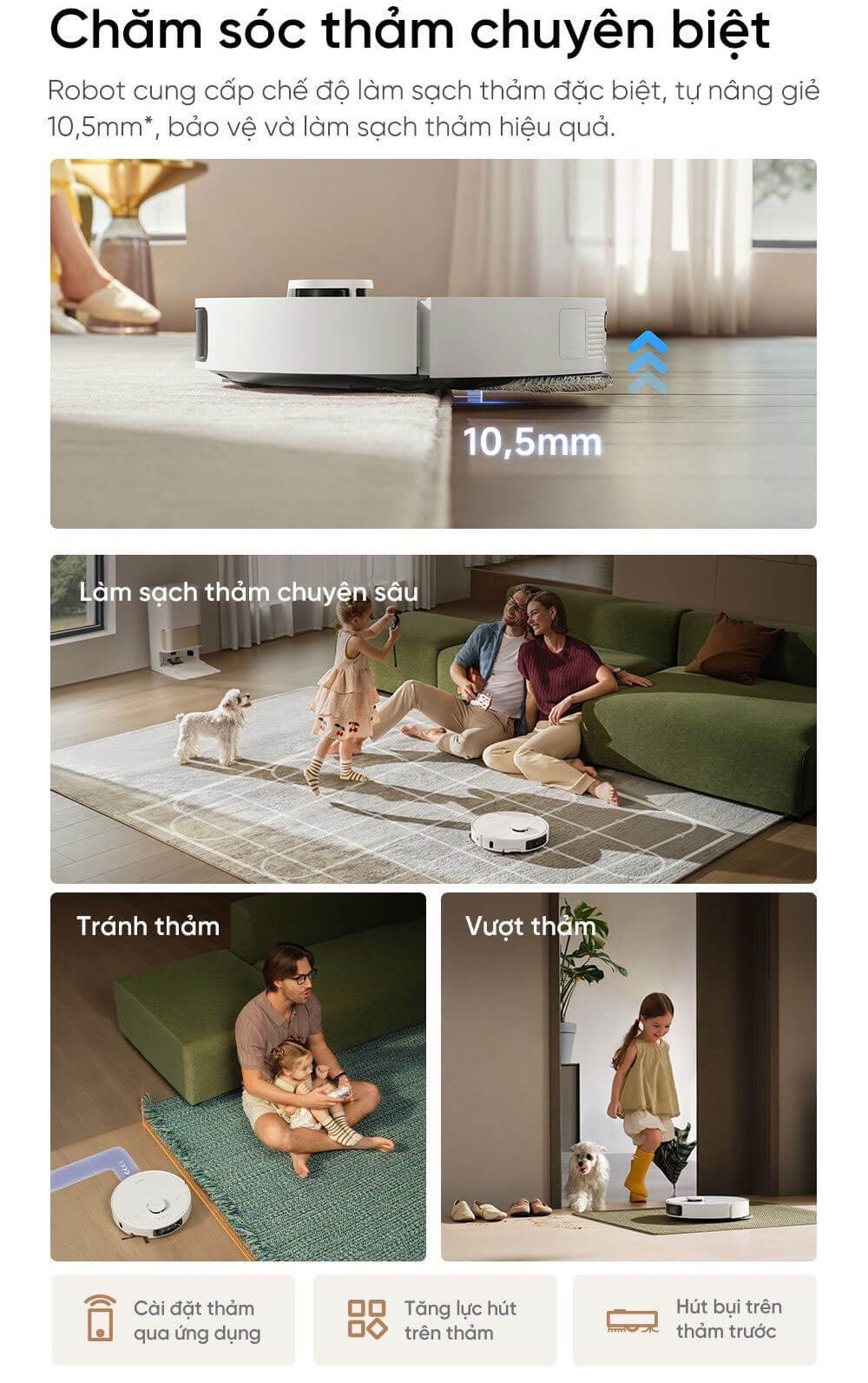 - Chăm sóc thảm chuyên biệt: Robot cung cấp các chế độ làm sạch thảm đặc biệt và tự động nâng giẻ lau lên 10,5mm, đảm bảo thảm luôn được bảo vệ và làm sạch hiệu quả.