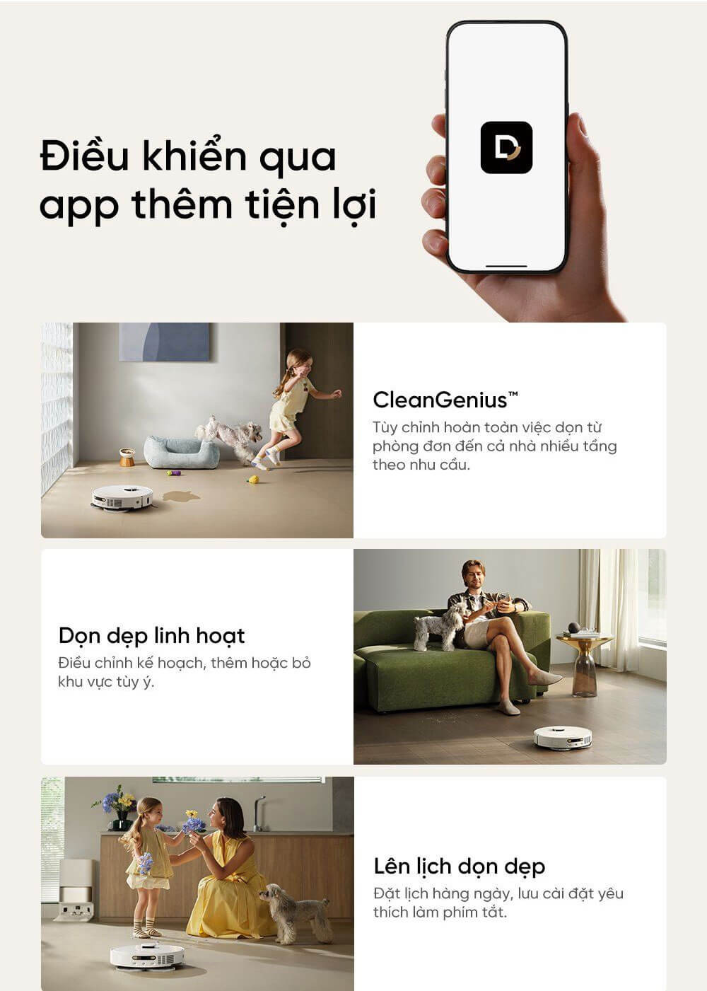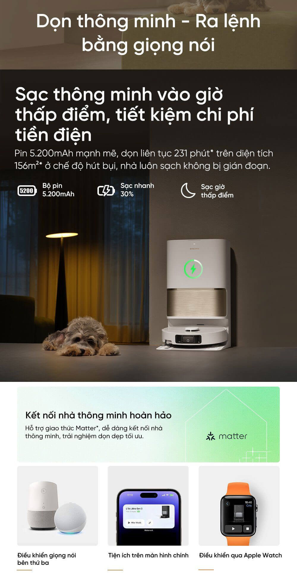- Kết nối nhà thông minh hoàn hảo: Nhờ hỗ trợ giao thức Matter, robot sẽ dễ dàng kết nối với ngôi nhà thông minh của bạn, mang đến trải nghiệm dọn dọn dẹp thông minh và tiện lợi tối đa.