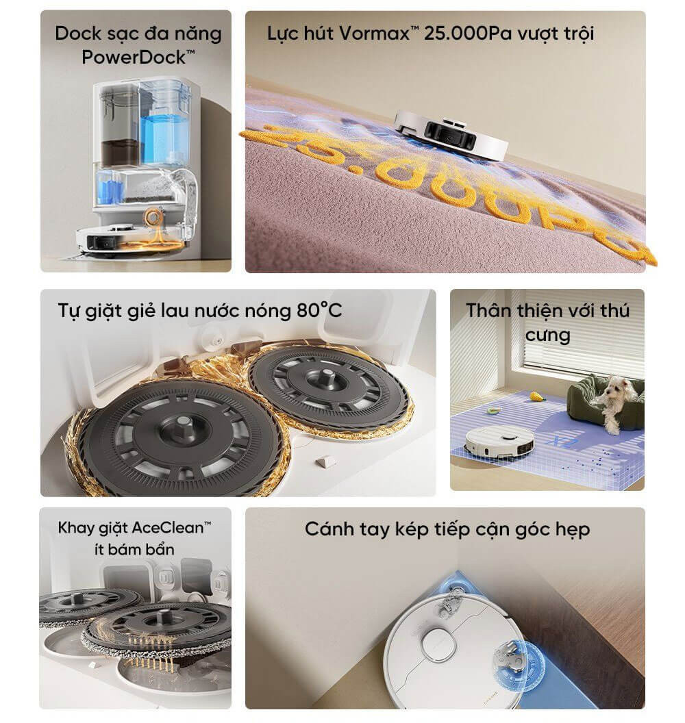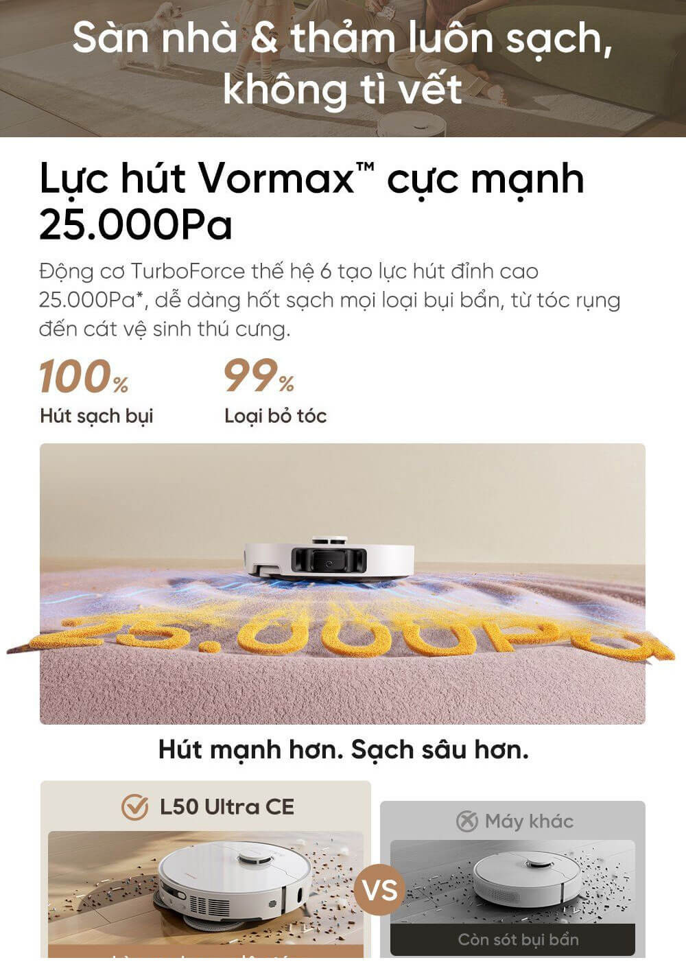 - Lực hút Vormax™ cực mạnh 25.000Pa: Động cơ TurboForce thế hệ 6 tạo lực hút đỉnh cao 25.000Pa, dễ dàng hốt sạch mọi loại bụi bẩn, từ tóc rụng đến cát vệ sinh thú cưng.