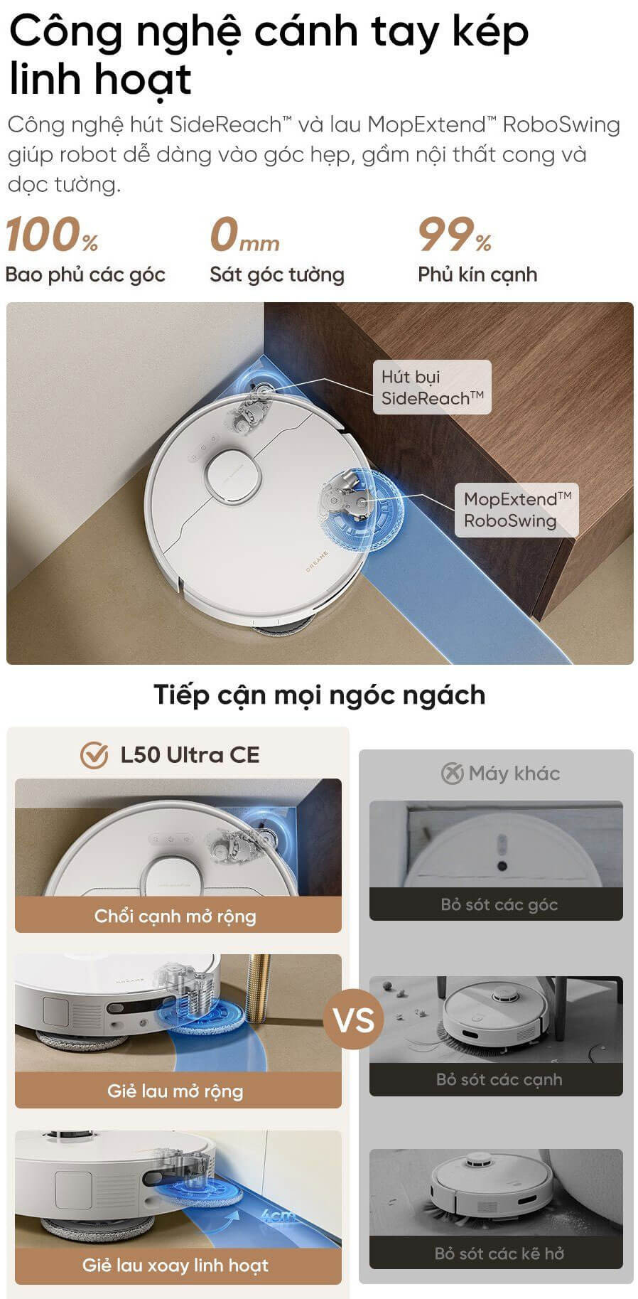- Công nghệ cánh tay kép linh hoạt: Công nghệ hút SideReach™ và lau MopExtend™ RoboSwing giúp robot dễ dàng vào góc hẹp, gầm nội thất cong và dọc tường.