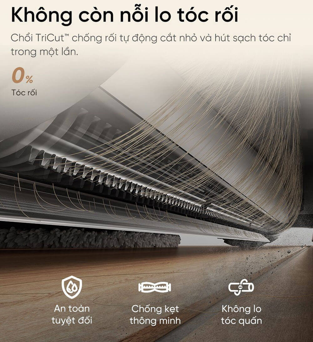 - Không còn nỗi lo tóc rối:Chổi TriCut™ chống rối tự động cắt nhỏ và hút sạch tóc chỉ trong một lần.