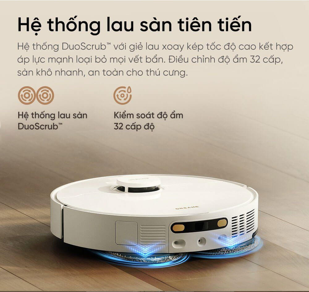 - Hệ thống lau sàn tiên tiến: Hệ thống DuoScrub™ với giẻ lau xoay kép tốc độ cao kết hợp áp lực mạnh loại bỏ mọi vết bẩn. Điều chỉnh độ ẩm 32 cấp độ, sàn khô nhanh, an toàn cho thú cưng.