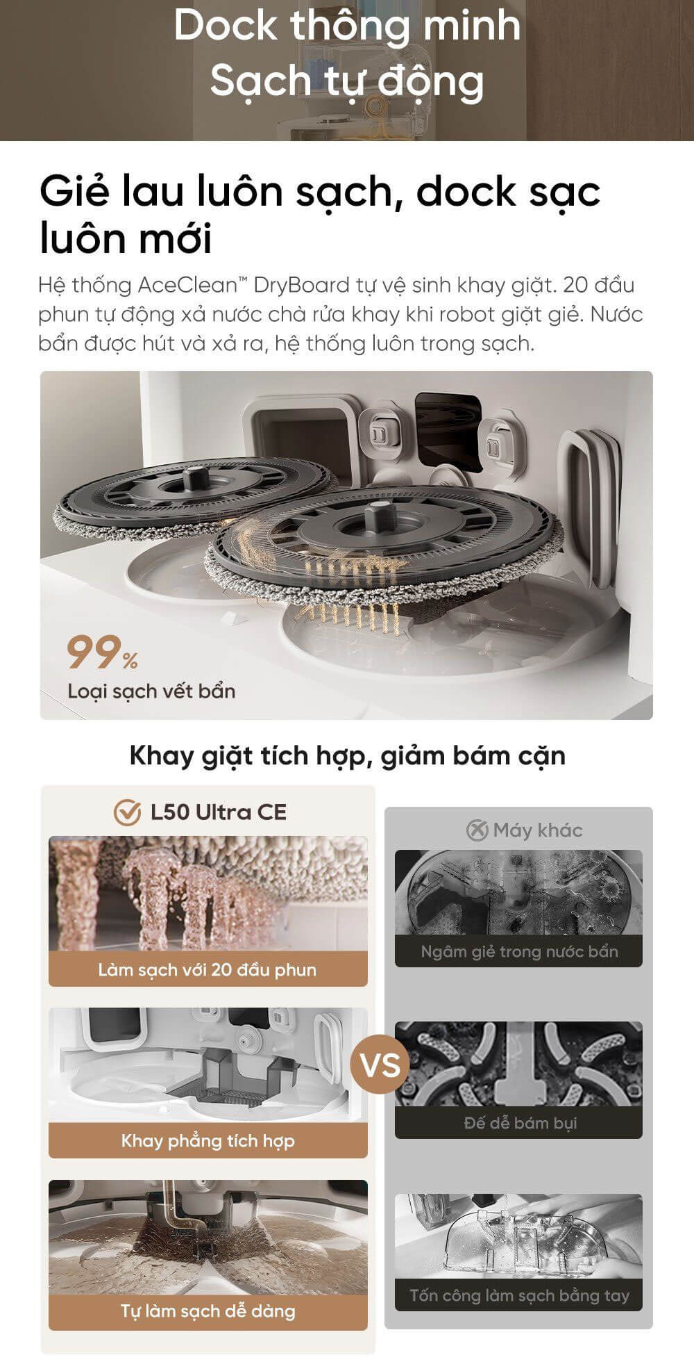 - Giẻ lau luôn sạch, dock luôn mới: Hệ thống AceClean™ DryBoard tự vệ sinh khay giặt. 20 đầu phun tự động xả nước chà rửa khay khi robot giặt giẻ. Nước bẩn được hút và xả ra, hệ thống luôn trong sạch.