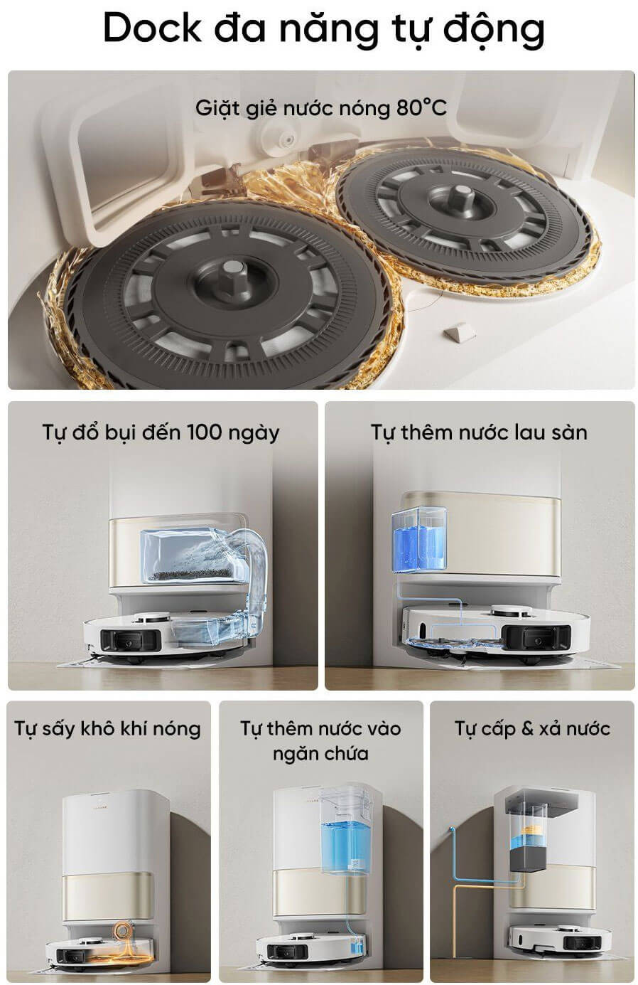 - Giặt giẻ nước nóng 85°C - Sấy khô khí nóng - Pha nước lau sàn tự đông - Thêm nước sạch vào bình chứa trên robot tự động - Hút rác tự động lên túi chứa - Công nghệ làm sạch cạnh tường: Mở rộng chổi cạnh và đế lau - Chổi cắt tóc chống rối (Phụ kiện mua thêm) |