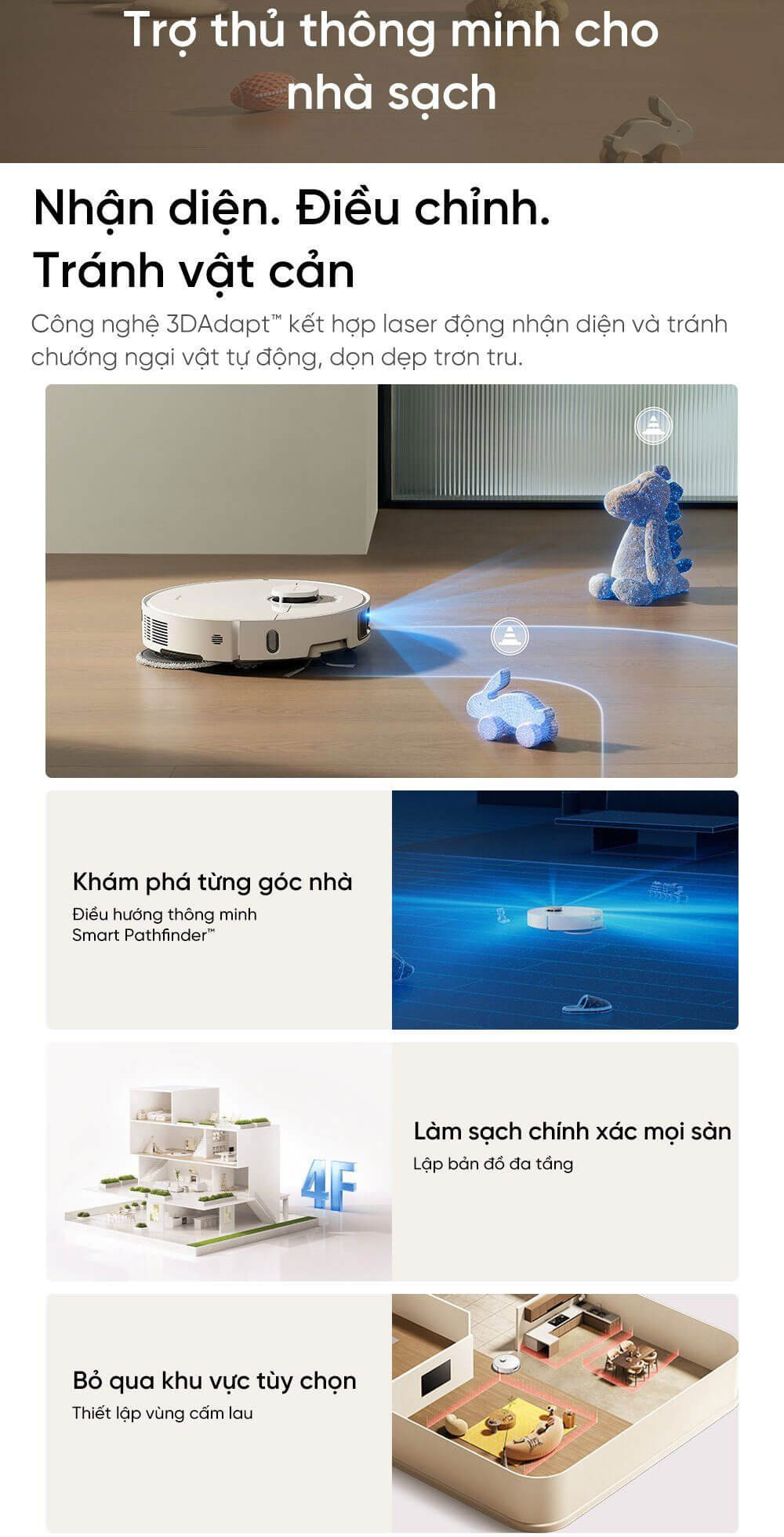 - Công nghệ 3DAdapt™ kết hợp laser động nhận diện và tránh chướng ngại vật tự động, dọn dẹp trơn tru.