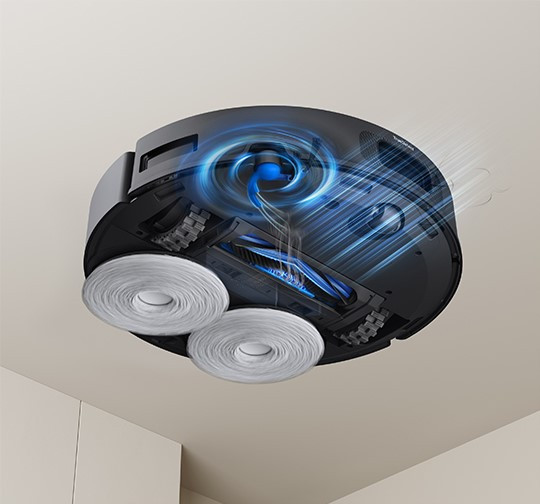 Hệ thống OZMO Turbo 2.0 hỗ trợ lau sàn hiệu quả cao trong quá trình vận hành. Hai đĩa lau quay liên tục tạo lực chà mạnh, giúp xử lý các vết bẩn cứng đầu như cà phê khô hay nước tương bám lâu ngày.