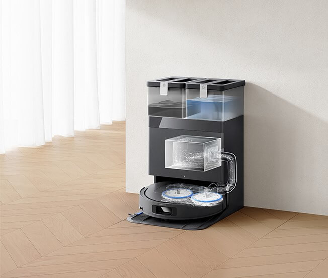- Trạm OMNI thiết kế tối giản: Tự giặt, sấy nóng 45°C, trữ bụi