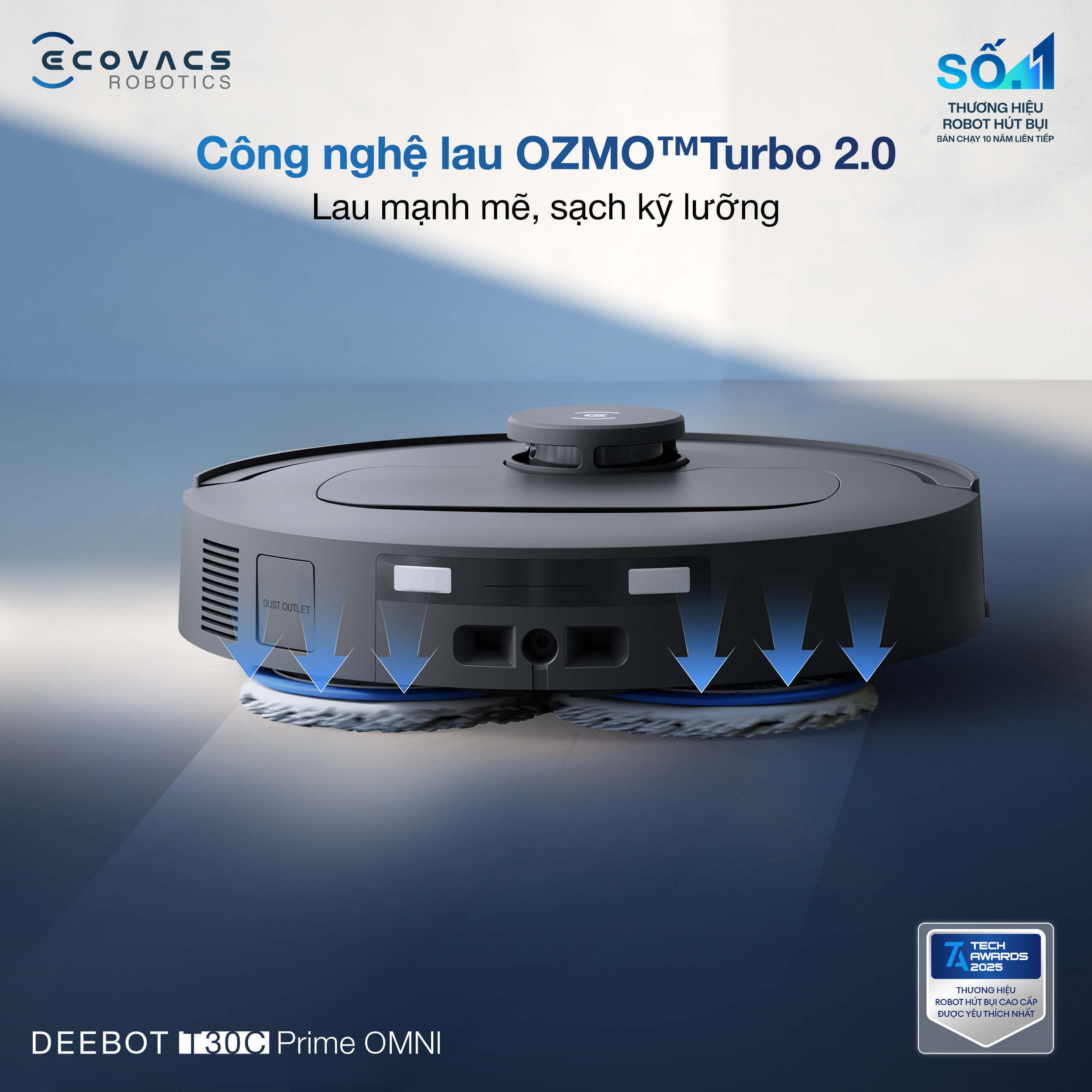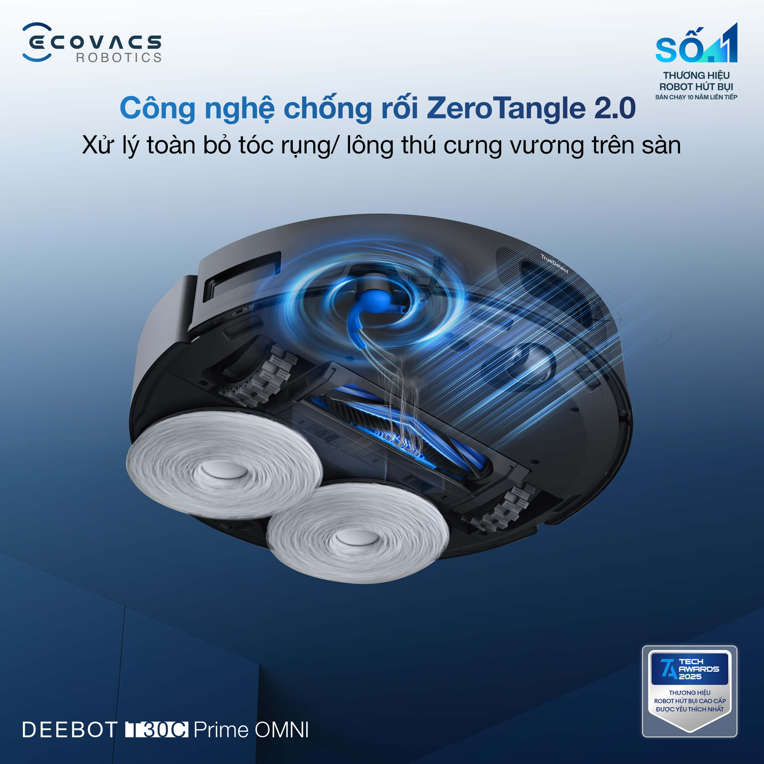 Robot hút bụi lau nhà Ecovacs Deebot T30C Prime Omni mang đến hiệu suất làm sạch mạnh mẽ nhờ lực hút 25.000Pa, kết hợp công nghệ chống rối ZeroTangle 2.0 giúp hạn chế tóc quấn. Hệ thống OZMO Turbo 2.0 nâng cao hiệu quả lau sàn, trong khi Carpets First giữ thảm luôn khô sạch.