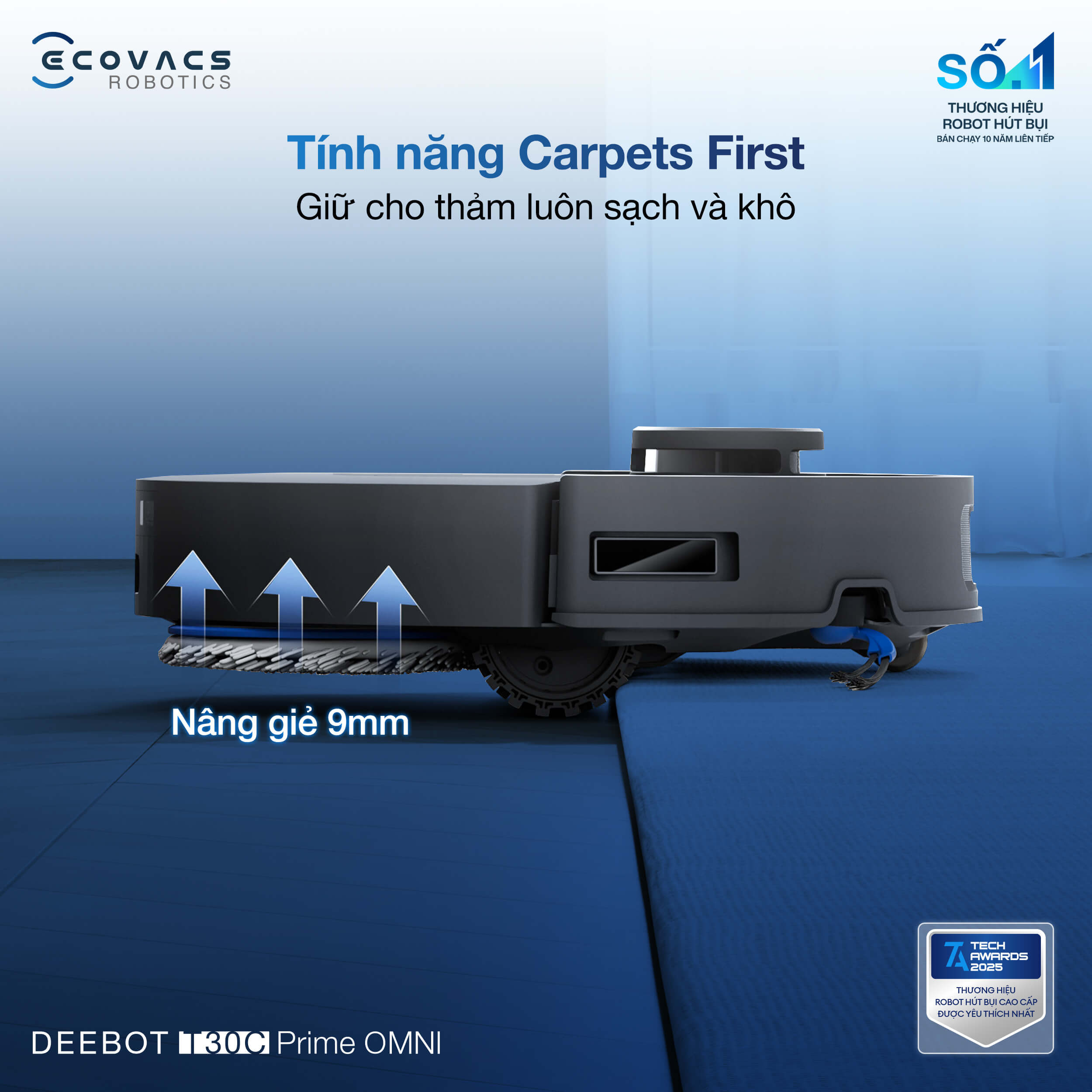 Tính năng Carpets First giúp giữ thảm luôn sạch, tránh tình trạng ẩm ướt trong quá trình làm sạch. Thiết bị ưu tiên xử lý khu vực thảm trước bằng chế độ hút bụi, hạn chế tiếp xúc của giẻ lau lên bề mặt sợi vải. Khi phát hiện thảm trong quá trình di chuyển, hệ thống tự động nâng giẻ lau lên tới 9mm, ngăn nước hoặc bụi bẩn lan sang khu vực khác.