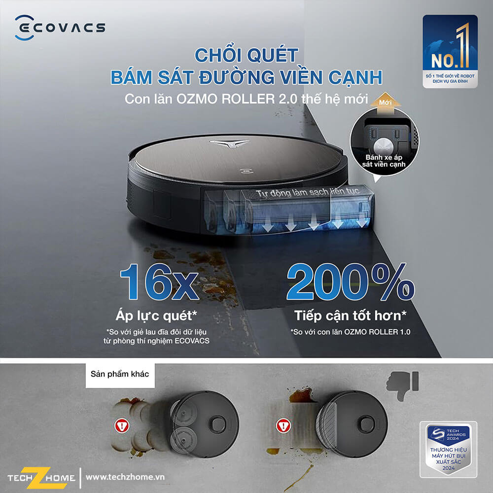Với áp lực lên đến 3800Pa mạnh hơn gấp 16 lần so với các hệ thống lau kép truyền thống. OZMO ROLLER 2.0 giúp DEEBOT dễ dàng xử lý các vết bẩn cứng đầu mà không cần người dùng tốn sức.Công nghệ bơm nước liên tục giữ cho khăn lau luôn sạch sẽ, ngăn mùi và đảm bảo vệ sinh suốt quá trình vận hành. Con lăn quay ở tốc độ 200 vòng/phút mang lại bề mặt sàn sáng bóng không vệt bẩn, không để lại nước dơ. Nhờ công thức đậm đặc từ Double-Effect Clean Solutions và con lăn làm sạch bằng sợi nylon mật độ cao, DEEBOT X11 Pro omni có thể loại bỏ cả những vết bẩn cứng đầu nhất nhưng vẫn nhẹ nhàng với bề mặt sàn.