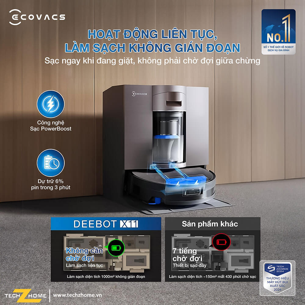 Công nghệ PowerBoost đột phá trên Ecovacs DEEBOT X11 OmniCyclone mang đến trải nghiệm làm sạch vượt trội với các đợt nạp năng lượng siêu nhanh, giúp thiết bị vận hành mượt mà, không ngừng nghỉ. Nhờ vào thuật toán tự tối ưu thông minh, robot có thể ưu tiên hoàn thành toàn bộ không gian một cách linh hoạt bằng cách tự động phân bổ nguồn pin.