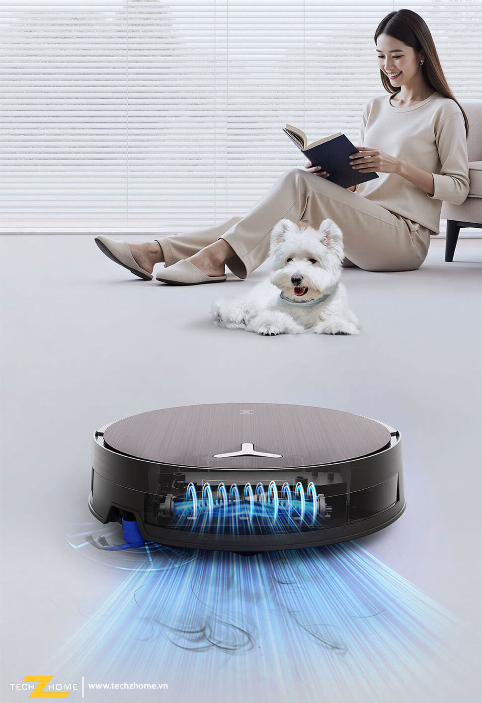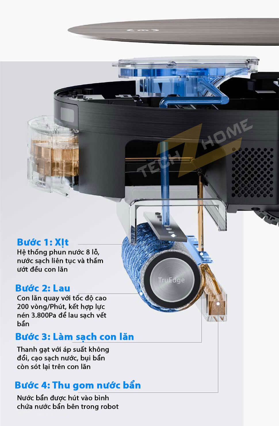 - Khi gặp thảm, robot sẽ nâng cao con lăn để tránh làm ướt và đồng thời tăng cường lực hút.