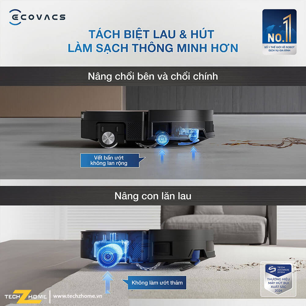 Hệ thống này đảm bảo sự tách biệt tối ưu giữa chế độ hút bụi khô và lau ướt, làm sạch chính xác từng loại bụi bẩn và bảo vệ sàn nhà một cách hiệu quả trong mọi tình huống.