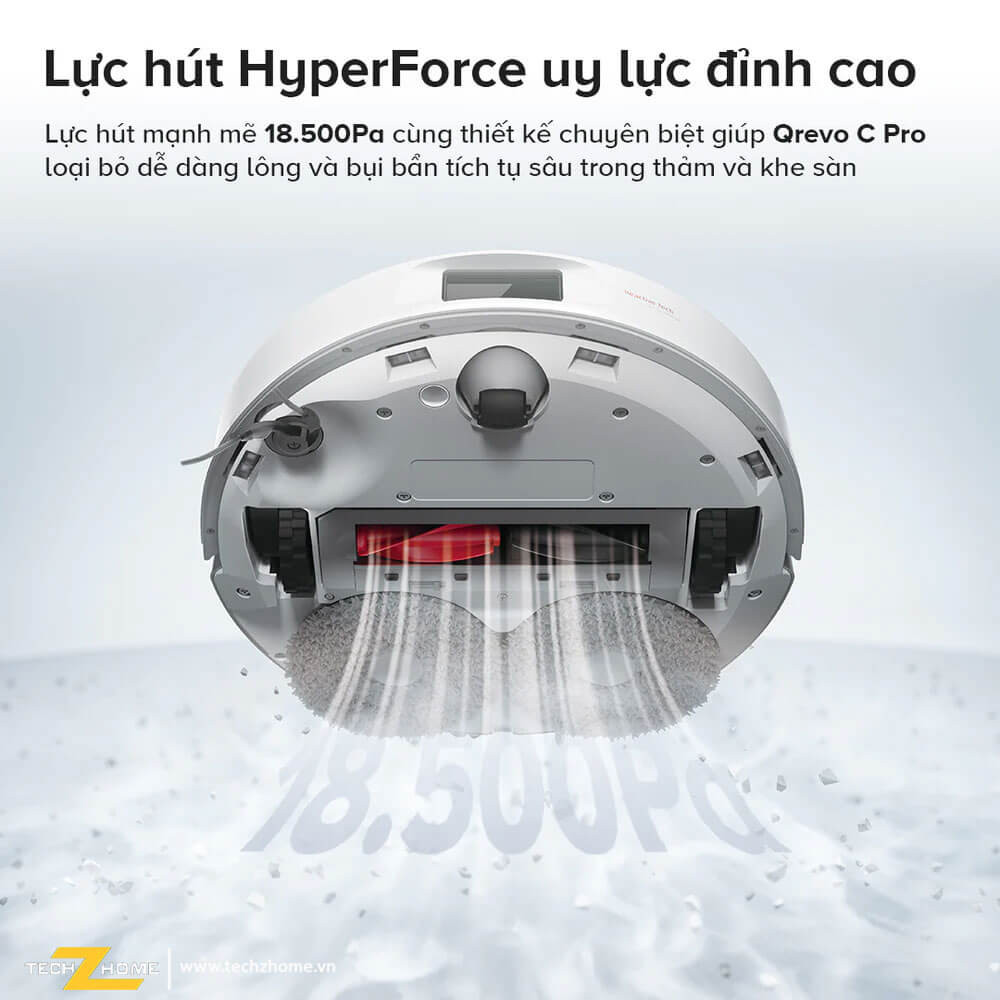 Lực hút mạnh mẽ 18.500Pa cùng thiết kế chuyên biệt giúp Qrevo C Pro loại bỏ dễ dàng lông và bụi bẩn tích tụ sâu trong thảm và khe sàn
