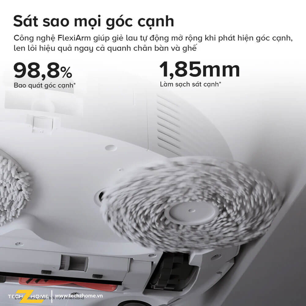 Công nghệ FlexiArm cho phép giẻ lau tự động mở rộng khi phát hiện góc cạnh, len lỏi dễ dàng quanh chân bàn ghế. Mang đến khả năng bao quát góc cạnh đến 98,8%* và làm sạch sát cạnh 1,85mm