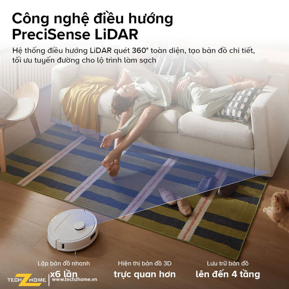 Hệ thống điều hướng LiDAR quét 360° toàn diện, tạo bản đồ chi tiết, tối ưu tuyến đường cho lộ trình làm sạch.