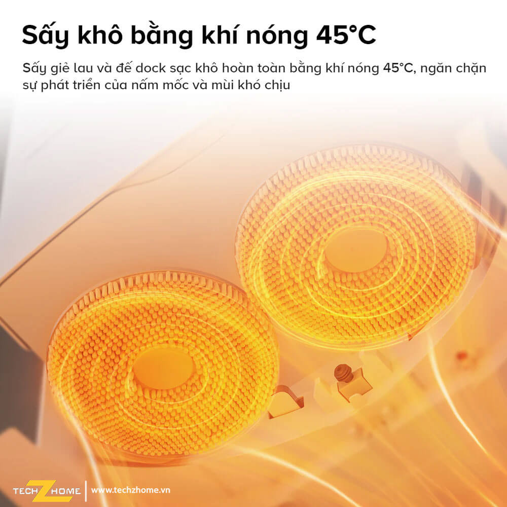 Sấy giẻ lau và đế dock sạc khô hoàn toàn bằng khí nóng 45°C, ngăn chặn sự phát triển của nấm mốc và mùi khó chịu